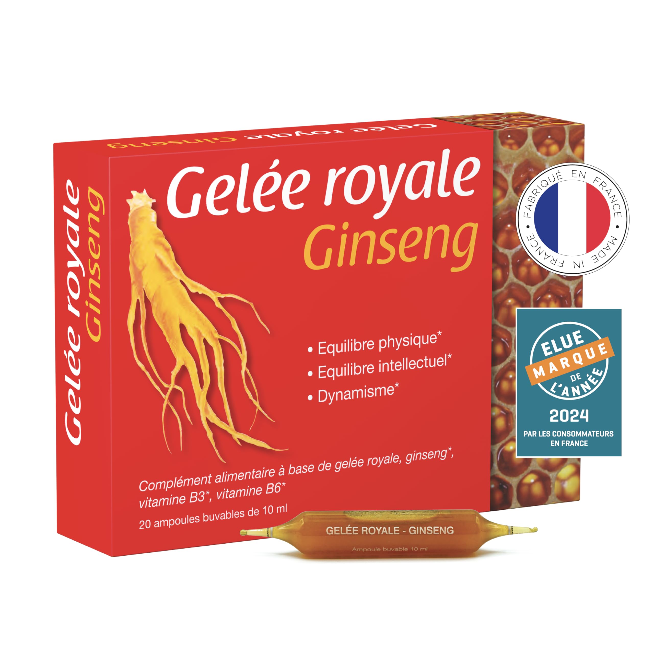 "Royal Ginseng Ampoule Jelly: A Natural and Sustainable Energy Discover a unique product combining royal jelly, treasure of the hive, and Korean red ginseng, renowned for its revitalizing properties. An ideal formula to regain dynamism, endurance and balance, whether to face intense fatigue or to support your natural defenses. A Revitalizing Alliance This formula contains 1000 mg of royal jelly, rich in 10-HDA, and 1800 mg of Korean red ginseng root equivalent, one of the varieties most concentrated in ginsenosides. These active ingredients act synergistically to boost your energy and support your physical and mental abilities. In addition, vitamins B3 and B6 play an essential role in reducing fatigue, strengthening cognitive functions and contributing to lasting vitality. The Benefits of this Dietary Supplement Dynamism: Red ginseng helps fight fatigue, while improving. endurance and performance: Royal jelly strengthens the immune system and supports daily energy Mental balance: Vitamins B3 and B6 promote mental clarity and optimal nervous functioning A Premium Selection for Superior Quality Organic royal jelly, an exclusive food of the queen bee, is known for its richness in natural nutrients and its benefits on longevity. ginsenosides than classic ginseng, offering exceptional effectiveness. A Versatile Formula Whether for an intense fatigue vitamin cure, a winter vitamin cure, or to strengthen your immune system, this ampoule based on royal jelly and organic red ginseng is your ally to regain energy and serenity, naturally. Rediscover your vitality with this royal jelly and ginseng ampoule, a real boost for the body and mind. INGREDIENTS "For 2 ampoules day: Water honey royal jelly (1 g) ginseng extract (120 mg, equivalent to 1800 mg of root) vitamin B3 (8 mg or 50 of the NRV ) vitamin B6 (0.7 mg or 50 of the NRV ). Frozen imported royal jelly. NRV: Nutritional Reference Value." DIRECTIONS FOR USE 2 ampoules per day in the morning for a minimum of 10 days. To be renewed if necessary or at each change of season. SAFETY WARNING Keep out of reach of young children. Food supplements should not be used as a substitute for a varied and balanced diet and a healthy lifestyle. Do not exceed the recommended daily dose. Reserved for adults. Do not use pregnant or breastfeeding women. For your health, eat at least five fruits and vegetables a day. If you are taking antidiabetic treatment, ask your doctor or pharmacist for advice. This food supplement is based on bee products, so it may contain traces of pollen. FRENCH LABORATORY - Created in Avignon, France, over 20 years ago, Laboratoire NaturAvignon creates effective products for better health. The brand was voted Brand of the Year 2024 by over 15,000 French consumers. RICH IN VITAMINS B3 AND B6 - Ginseng combined with vitamin B3 and vitamin B6 helps maintain brain function. They also contribute to normal psychological functions such as memory retention. KOREAN RED GINSENG 2 TIMES MORE CONCENTRATED - The extract selected by Laboratoire NaturAvignon is an authentic Korean red ginseng root extract that is twice as concentrated in ginsenosides as Chinese ginseng. It is the best ginseng in the world. ROYAL JELLY 1000mg - Royal jelly is a precious cocktail of active nutrients. Within the hive, future queens feed exclusively on royal jelly and live on average 40 times longer than worker bees. Royal jelly ampoules are ideal as a winter vitamin treatment. VITALITY, ADULT IMMUNITY, INTELLECTUAL VIVACITY - A unique formula for 4 actions: strengthens adult immune defense, helps regain vigor and energy, strengthens brain function and improves physical performance. "Gelée Royale Ginseng Ampoule : Une Énergie Naturelle et Durable Découvrez un produit unique alliant la gelée royale, trésor de la ruche, et le ginseng rouge de Corée, réputé pour ses propriétés revitalisantes. Une formule idéale pour retrouver dynamisme, endurance et équilibre, que ce soit pour affronter une fatigue intense ou pour soutenir vos défenses naturelles. Une Alliance Revitalisante Cette formule contient 1000 mg de gelée royale, riche en 10-HDA, et 1800 mg d'équivalent racine de ginseng rouge de Corée, l'une des variétés les plus concentrées en ginsénosides. Ces actifs agissent en synergie pour booster votre énergie et soutenir vos capacités physiques et mentales. En complément, les vitamines B3 et B6 jouent un rôle essentiel pour réduire la fatigue, renforcer les fonctions cognitives et contribuer à une vitalité durable. Les Bienfaits de ce Complément Alimentaire Dynamisme : Le ginseng rouge aide à combattre la fatigue, tout en améliorant l'endurance et les performances. Équilibre physique : La gelée royale renforce les défenses immunitaires et soutient l'énergie quotidienne. Équilibre mental : Les vitamines B3 et B6 favorisent la clarté mentale et un fonctionnement nerveux optimal. Une Sélection Premium pour une Qualité Supérieure La gelée royale bio, aliment exclusif de la reine des abeilles, est connue pour sa richesse en nutriments naturels et ses bienfaits sur la longévité. Le ginseng rouge de Corée, reconnu comme le meilleur au monde, est deux fois plus concentré en ginsénosides que le ginseng classique, offrant une efficacité exceptionnelle. Une Formule Polyvalente Que ce soit pour une cure de vitamines fatigue intense, une cure vitamine hiver, ou pour renforcer vos défenses immunitaires, cette ampoule à base de gelée royale et de ginseng rouge bio est votre alliée pour retrouver énergie et sérénité, naturellement. Redécouvrez votre vitalité avec cette ampoule gelée royale et ginseng, un véritable boost pour le corps et l'esprit." INGRÉDIENTS "Pour 2 ampoules jour : Eau miel gelée royale (1 g) extrait de ginseng (120 mg, équivalent à 1800 mg de racine) vitamine B3 (8 mg soit 50 des VNR ) vitamine B6 (0.7 mg soit 50 des VNR ). Gelée royale importée congelée. VNR : Valeur Nutritionnelle de Référence." MODE D'EMPL