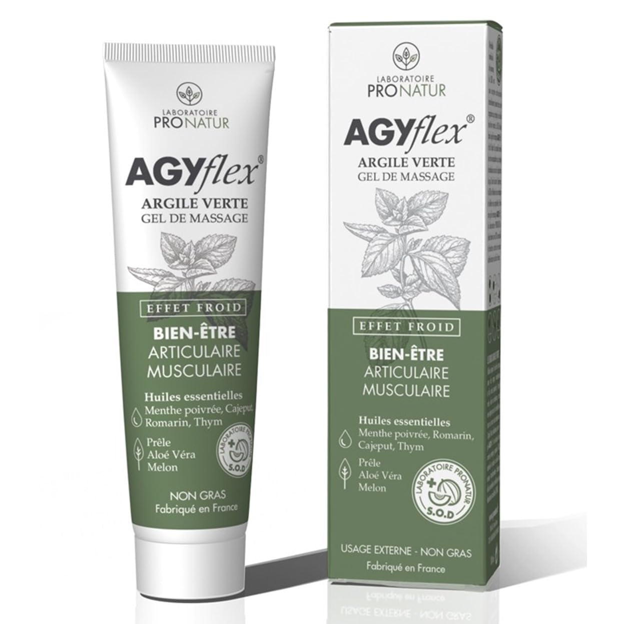 Massage gel based on green clay, cold effect with seven plants, dedicated to joint and muscular well-being. Formulated with essential oils, aloe vera and melon SOD, it is suitable for athletes before or after exercise as well as comfort for seniors. Tested by a dermatologist and recommended by physiotherapists and osteopaths, the AGYflex ARGILE VERTE massage gel is directly inspired by nature. Its synergy of 7 plants combined with ARGIflex green clay, delivers all their soothing benefits for lasting well-being and relief. Designed with horsetail and aloe vera extracts, as well as essential oils with anti-inflammatory properties (peppermint, cajeput, rosemary and thyme), it improves joint and muscle comfort, without heating or tightness. The presence of melon SOD, a powerful antioxidant, makes its formula particularly innovative. The result of more than 12 years of research and development in partnership with doctors, physiotherapists, naturopaths and engineers, this green clay massage gel is effective in skin massage to reduce swelling, relax contractures, improve the flexibility of tendons, relieve cramps and reduce joint stiffness. For all areas of the body (back, neck, shoulders, hips, knees, ankles, hands) and aimed at a wide audience, from children from 7 years old to seniors, including athletes before or after exercise. Made in France by the Pronatur Saint-Rémy-de-Provence laboratory Please note: AGYflex GREEN CLAY MASSAGE GEL is neither a medicine nor a medical device, but a natural health product for joint and muscular well-being. It helps relieve everyday trauma but in no way replaces the medical treatments prescribed by your doctor. DIRECTIONS FOR USE 2 to 3 applications per day as neededMade in France: A quality local product, proudly made in the country. Certification: ISO 113485 Gel production site for medical devices, guaranteeing the quality and safety of the product. Recommended use: 2 to 3 applications per day as needed, ideal for relieving muscle and joint pain. Brand: Laboratoire Pronatur, a manufacturer renowned for its quality products. Ingredients: Water, Alcohol Denat., Peppermint Oil, Menthol, Polyacrylamide, Aloe Barbadensis Leaf Juice, Camphor, Illite, C13-14 Isoparaffin, Propylene Glycol, Rosemary Oil, Cajuput Oil, Laureth-7, Equisetum Arvense Extract, Thyme Oil, O-Cymen-5-ol, Maltodextrin, Hydroxypropyltrimonium Maltodextrin Crosspolymer, Watermelon Extract, Citric Acid, Potassium Sorbate, Sodium Benzoate, Patent Blue V, Sunset Yellow FCF, Allura Red AC, Sodium Sulfate, Limonene, Linalool, Geraniol, Eugenol, Citronellol. Gel de massage à base d'argile verte, effet froid aux sept plantes, dédié au bien-être articulaire et musculaire. Formulé avec des huiles essentielles, de l'aloe vera et de la SOD de melon, il est adapté aux sportifs avant ou après l'effort ainsi que le confort des seniors. Testé par un médecin dermatologue et recommandé par les kinésithérapeutes et les ostéopathes Le gel de massage AGYflex ARGILE VERTE s'inspire directement de la nature. Sa synergie de 7 plantes combinées avec l'argile verte ARGIflex, délivre tous leurs bienfaits apaisants pour un bien-être et un soulagement durables. Conçu avec des extraits de prêle et d'aloe vera, ainsi que des huiles essentielles aux propriétés anti-inflammatoires (menthe poivrée, cajeput, romarin et thym), il améliore le confort articulaire et musculaire, sans effet d'échauffement ou de tiraillement. La présence de SOD de melon, puissant antioxydant, rend sa formule particulièrement innovante. Fruit de plus de 12 ans de recherche et développement en partenariat avec des médecins, des kinésithérapeutes, des naturopathes et des ingénieurs, ce gel de massage à l'argile verte est efficace en massage cutané pour résorber les gonflements, détendre les contractures, améliorer la souplesse des tendons, dénouer les crampes et atténuer les raideurs articulaires. Pour toutes les zones du corps (dos, nuque, épaules, hanches, genoux, chevilles, mains) et adressé à un large public, des enfants à partir de 7 ans aux seniors, en passant par les sportifs avant ou après l'effort. Fabriqué en France par le laboratoire Pronatur Saint-Rémy-de-Provence À noter : AGYflex ARGILE VERTE GEL DE MASSAGE n'est ni un médicament, ni un dispositif médical, mais un produit naturel de santé pour le bien-être articulaire et musculaire. Il permet de soulager les traumatismes du quotidien mais ne remplace en rien les traitements médicaux prescrits par votre médecin. MODE D'EMPLOI 2 à 3 applications par jour selon besoinFabriqué en France : Un produit local de qualité, fabriqué avec fierté dans le pays. Certification : Site de production Gel ISO 113485 pour dispositifs médicaux, garantissant la qualité et la sécurité du produit. Usage recommandé : 2 à 3 applications par jour selon les besoins, idéal pour soulager les muscles et les articulations. Marque : Laboratoire Pronatur, un fabricant réputé pour ses produits de qualité. Composition : Eau, alcool dénaturé, huile essentielle de menthe poivrée, menthol, polyacrylamide, jus de feuille d'aloès, camphre, illite, isoparaffine C13-14, propylène glycol, huile essentielle de romarin, huile essentielle de cajeput, laureth-7, extrait d'équisetum arvense, huile essentielle de thym, o-cymène-5-ol, maltodextrine, hydroxypropyltrimonium malto déxtrin crosspolymer, extrait de pastèque, acide citrique, sorbate de potassium, benzoate de sodium, bleu patenté V, jaune orangé S, rouge allura AC, sodium sulfate, limonène, linalol, géraniol, eugénol, citronellol.