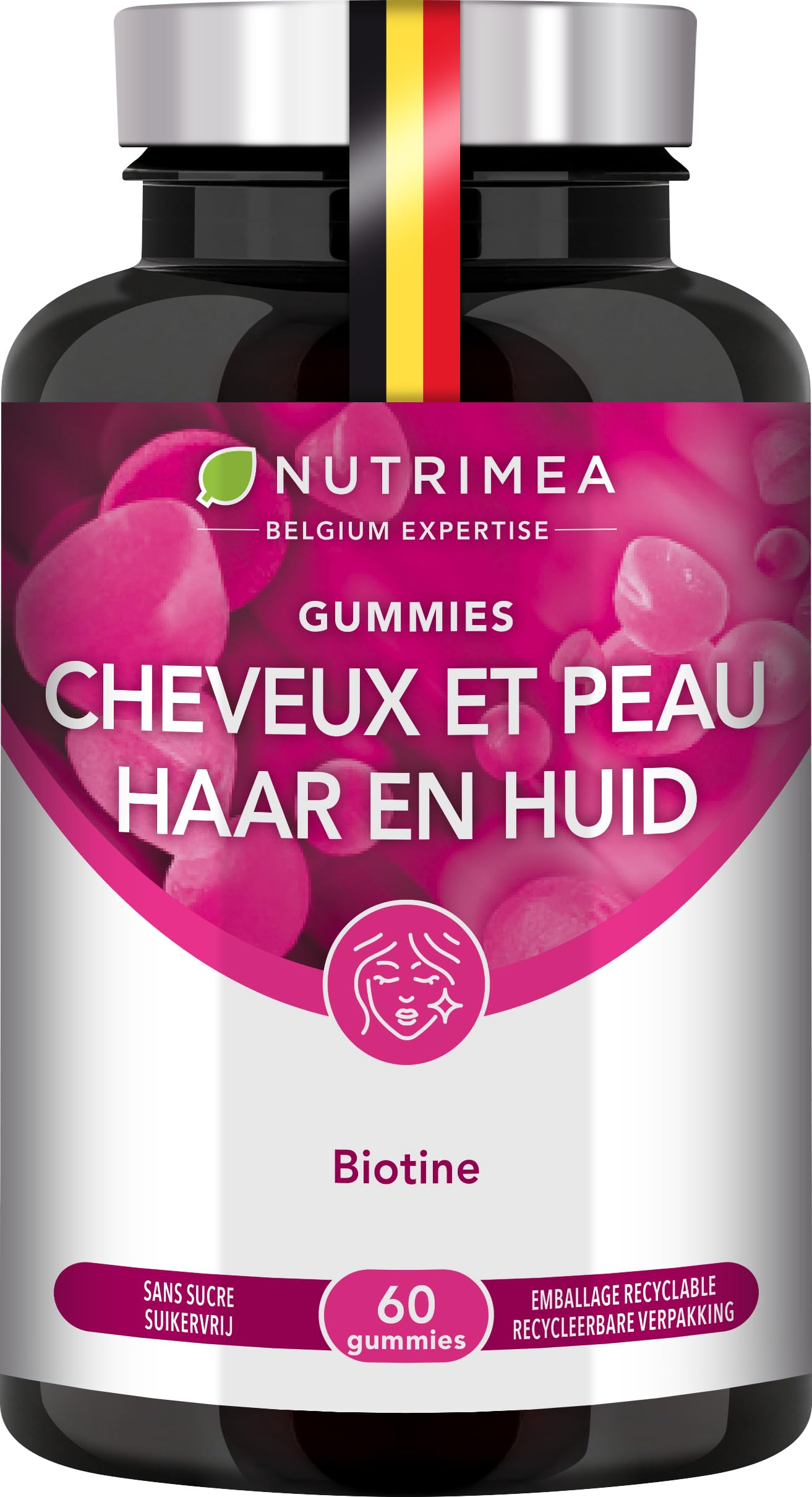 Dry, brittle hair lacking vitality? Damaged nails? Pale or tired skin? Nutrimea has formulated an innovative food supplement in gummy form, concentrating the essentials for healthy hair and nails. It contains a carefully selected blend of vitamins and minerals such as: Biotin, or vitamin B8, which contributes to healthy hair. It also contributes to healthy skin. Selenium, an essential trace element for the maintenance of normal nails and hair. Zinc, which contributes to the maintenance of normal nails, skin, and hair. It also plays a role in the cell division process. Zinc is involved in the normal synthesis of proteins, such as keratin. Keratin is also a major component of nails. Vitamin C, which contributes to collagen formation for normal skin function. This formula is sugar-free and made in France. When do we recommend our Hair and Nails food supplement? To give your hair a boost in spring and autumn for damaged and brittle nails if your hair lacks tone and vitality after stress: biotin contributes to the proper functioning of the nervous system and normal psychological functions. INGREDIENTS (2 gummies): Bulking agent: maltitol, gelling agent: pectin, acidifiers: sodium citrates and citric acid, natural flavoring, ascorbic acid and sodium ascorbate (vitamin C 40 mg - 50.0 of the NRV ), zinc citrate (zinc 5 mg - 50.0 of the NRV ), concentrate (carrot and blackcurrant), sodium selenite (selenium 55 µg - 100 of the NRV ), glazing agent: carnauba wax, pyridoxine hydrochloride (vitamin B6 1.16 mg - 82.7 of the NRV ), biotin (vitamin B8 95 µg - 190 of the NRV ). NRV: Nutrient Reference ValuesThis product can be consumed after the date indicated on the product. THE NUTRIMEA PROMISE Our formula is based on a rigorous selection of the best ingredients to offer you a complete and high-quality product. Our gummies are sugar-free, free of artificial flavors, and made in France. They contain pectin and are 100 vegan. You'll love their delicious fruity taste and their fun, innovative format. FRENCH FORMULA AND EXPERTISE Nutrimea also relies on a committee of 5 recognized experts in the fields of medicine, research, and traceability. Our products are made in France and are ISO 22000, HACCP, and GMP certified. VITAMIN AND MINERALS COCKTAIL Zinc and selenium contribute to healthy nails and hair. They also play a role in the cell division process. Zinc is involved in the normal synthesis of proteins, such as keratin, which is also a major component of nails. Vitamin C contributes to the formation of collagen, an essential component of the skin. THE BENEFITS OF BIOTIN Dry, brittle hair lacking vitality? Damaged nails? Pale or tired skin? Nutrimea has formulated an innovative food supplement in gummy form, concentrating the essentials for healthy hair and nails. Known as vitamin B8, biotin is essential for our body. A low intake can lead to hair loss and brittle, fragile nails.Nutrimea - Gummies Cheveux et Ongles - Santé des Cheveux et des Ongles - Qualité de la Peau - Avec Biotine, Zinc et Sélénium - 60 Gummies Vegan - Sans Sucres - Goût Fraise - Fabriqué en FranceDESCRIPTION DU PRODUIT DESCRIPTION DU PRODUIT Cheveux secs, cassants, en manque de vitalité ? Ongles abîmés ? Peau pâle ou fatiguée ? Nutrimea a formulé pour vous un complément alimentaire innovant sous forme de gummies, concentrant l'essentiel pour la santé des cheveux et des ongles. Il contient un mélange réfléchi de vitamines et minéraux comme : La biotine, ou vitamine B8, qui contribue à la bonne santé des cheveux. Elle participe également à la santé de la peau. Le sélénium, un oligo-élément essentiel au maintien normal des ongles et des cheveux Le zinc qui contribue au maintien des ongles, d'une peau et de cheveux normaux. Il joue aussi un rôle dans le processus de division cellulaire. Le zinc intervient dans la synthèse normale des protéines, comme la kératine. La kératine est également un constituant majeur de l'ongle. La vitamine C qui contribue à la formation du collagène pour assurer la fonction normale de la peau. Cette formule est sans sucre et fabriquée en France. Dans quels cas nous recommandons notre complément alimentaire Cheveux et ongles ? Pour donner un coup de pouce à votre chevelure au printemps et en automne En cas d'ongles abîmés et cassants Si vos cheveux manquent de tonus et de vitalité après un stress : la biotine contribue au bon fonctionnement du système nerveux et à des fonctions psychologiques normales. INGRÉDIENTS (2 gummies) : agent de charge : maltitol, gélifiant : pectine, acidifiants : citrates de sodium et acide citrique, arôme naturel, acide ascorbique et ascorbate de sodium (vitamine C 40 mg - 50,0 des VNR ), citrate de zinc (zinc 5 mg - 50,0 des VNR ), concentré (carotte et cassis), sélénite de sodium (sélénium 55 µg - 100 des VNR ), agent d'enrobage : cire de carnauba, chlorhydrate de pyridoxine (vitamine B6 1,16 mg - 82,7 des VNR ), biotine (vitamine B8 95 µg - 190 des VNR ). VNR : Valeurs Nutritionnelles de RéférenceCe produit peut être consommé après la date indiquée sur le produit. LA PROMESSE NUTRIMEA Notre formule repose sur une sélection rigoureuse des meilleurs ingrédients afin de vous proposer un produit complet et de qualité. Nos gummies sont sans sucre, sans arômes artificiels et fabriquées en France. Elles contiennent de la pectine et sont 100 vegan. Vous allez adorez leur bon goût de fruits et leur format ludique et innovant. FORMULE ET EXPERTISE FRANÇAISES Nutrimea s'appuie aussi sur un comité de 5 experts reconnus dans les domaines de la médecine, de la recherche, de la traçabilité. Nos produits sont fabriqués en France et certifiés ISO 22000, HACCP et BPF. COCKTAIL DE VITAMINE ET MINÉRAUX Le zinc et le sélénium contribuent à la santé des ongles et des cheveux. Il joue aussi un rôle dans le processus de division cellulaire. Le zinc intervient dans la synthèse normale des protéines, comme la kératine, qui 