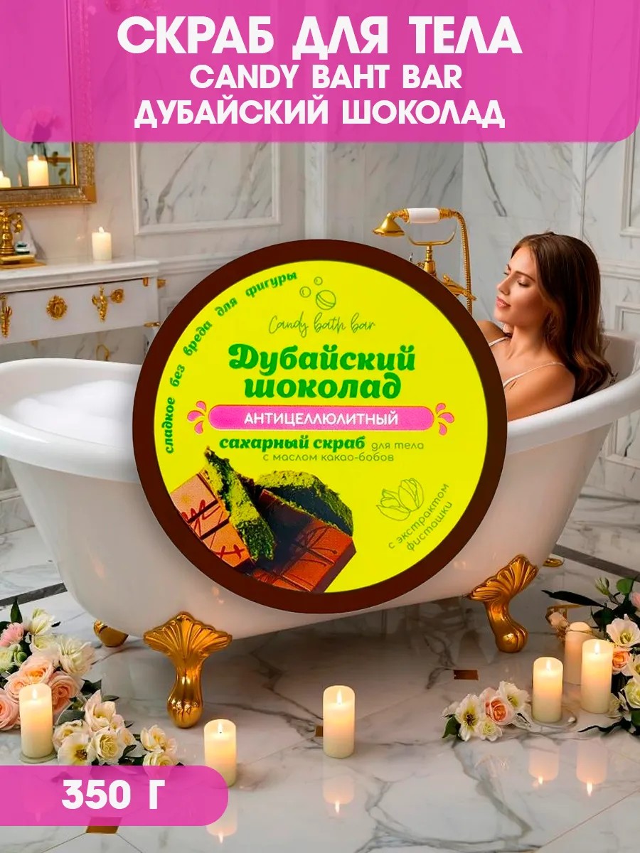 Candy Baht Bar Salt and Sugar Body Scrub with Oils, 350g, Dubai Chocolate. The Candy Baht Bar salt and sugar scrub with the aroma of Dubai chocolate is the perfect combination of intensive cleansing and gentle skin care. Natural salt crystals gently exfoliate dead skin cells, while sugar leaves the skin feeling soft and velvety. Nourishing oils deeply moisturize and nourish the skin, leaving it smooth and silky. The rich aroma of Dubai chocolate creates an atmosphere of luxury and pleasure, turning the treatment into a true spa ritual. Before use, stir the scrub in the jar so that the oil is evenly distributed, massage a handful of scrub onto damp skin, and rinse with water. Rather than drying immediately with a towel, allow the oil to sit for about 5 minutes for better absorption. Use 2-3 times a week.