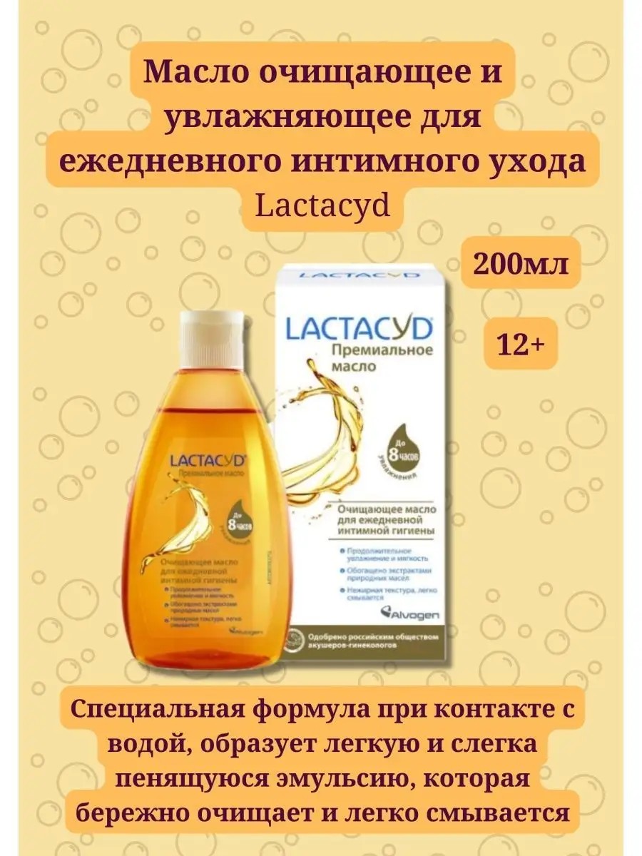 lactacyd масло очищающее и увлажняющее для ежедневного интимного ухода 200мл - нежный лосьон с маслами, золотистого цвета, с легким и приятным ароматом. Специальная формула при контакте с водой, образует легкую и слегка пенящуюся эмульсию, которая бережно очищает и легко смывается. премиальное очищающее масло создано специально для девушек и женщин предпочитающих: