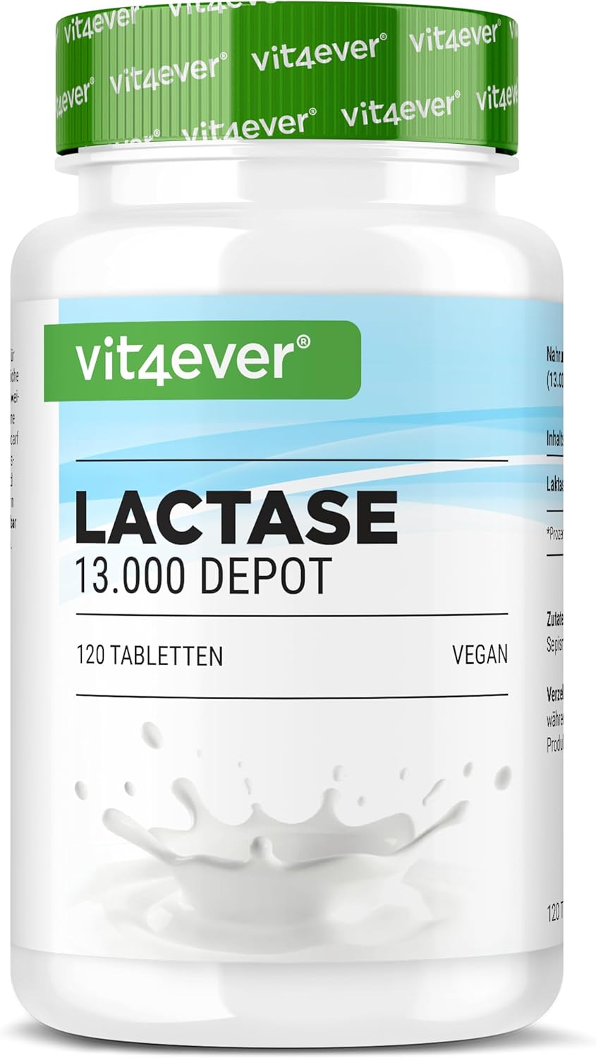 Production & your satisfaction: The Vit4Ever range includes numerous nutritional supplements for every target group.All products are made from high -quality premium raw materials and exclusively in certified EU operations.Our production locations include Germany & the Netherlands.If you are not satisfied with our product or need help and advice, please contact us.Regardless of laboratory testing: laboratory tests for the plant substance salaries, loads & contaminants, such as heavy metals, mold, salmonella & other relevant test criteria.Vegan & without undesirable additives: Our lactase tablets do not contain undesirable additives & are 100% vegan.The tablets are free from magnesium stearate, separator, flavors, dyes, stabilizers, fillers, gelatin and of course also lactose -free, gluten -free, without preservatives & without genetic engineering.Light application: Each tablet contains a total of 13000 FFC units of the pure lactase enzyme, so it is able to dismantle approx. 21g of lactose.In addition, our lactasis 13000 tablets are reduced in fillers (very small), easy to swallow and freely harmful and unnecessary additives.Optimal in the case of lactose intolerance, e.g. to enjoy dairy products again carefree again or to better process lactose -contained dishes and drinks.Lactose digestion improves lactase.Excellent price-performance ratio: 120 high-dose lactase tablets with 13,000 FCC units per tablet.The tablets can be taken with sufficient liquid before or during the consumption of dairy products.Thanks to the brand raw material Sepismart with the unique Slow Rlease Technology, our lactase tablets have a custody effect, so that the valuable lactase enzyme is slowly released to the body.HERSTELLUNG & IHRE ZUFRIEDENHEIT: Das Vit4ever Sortiment umfasst zahlreiche Nahrungsergänzungsmittel für jede Zielgruppe. Alle Produkte werden aus hochwertigen Premium Rohstoffen und ausschließlich in zertifizierten EU Betrieben hergestellt. Zu unseren Produktionsstandorten zählen Deutschland & die Niederlande. Sollten Sie mit unserem Produkt nicht zufrieden sein, oder aber Hilfe und Beratung benötigen, kontaktieren Sie uns gerne. UNABHÄNGIG LABORGEPRÜFT: Laborgeprüft auf die Pflanzenstoffgehälter, Belastungen & Verunreinigungen, wie z.B. Schwermetalle, Schimmelpilze, Salmonellen & weitere relevante Prüfkriterien. VEGAN & OHNE UNERWÜNSCHTE ZUSÄTZE: Unsere Laktase Tabletten enthalten keine unerwünschten Zusätze & sind zu 100% vegan. Die Tabletten sind frei von Magnesiumstearat, Trennmitteln, Aromen, Farbstoffen, Stabilisatoren, Füllstoffen, Gelatine und selbstverständlich auch laktosefrei, glutenfrei, ohne Konservierungsstoffe & ohne Gentechnik. LEICHTE ANWENDUNG: Jede Tablette enthält ganze 13000 FFC-Einheiten des reinen Lactase Enzymes, somit ist es in der Lage, ca. 21g Lactose abzubauen. Zudem sind unsere Lactase 13000 Tabletten Füllstoff-reduziert (sehr klein), gut zu schlucken und frei schädlichen und überflüssigen Zusatzstoffen. Optimal bei Laktoseintoleranz, um z.B. Milchprodukte wieder unbeschwert zu genießen oder Laktosehaltige Speisen und Getränke besser zu verarbeiten. Lactase verbessert die Laktoseverdauung. HERVORRAGENDES PREIS-LEISTUNGSVERHÄLTNIS: 120 hochdosierte Laktase Tabletten mit 13.000 FCC-Einheiten je Tablette. Die Tabletten können vor oder während des Verzehrs von Milchprodukten mit ausreichend Flüssigkeit eingenommen werden. Dank des Markenrohstoffes Sepismart mit der einzigartigen Slow Rlease Technology habe unsere Laktase Tabletten einen Depoteffekt, so dass das wertvolle Laktase Enzym langsam an den Körper abgegeben wird.Laktase 13.000 Depot - 120 Tabletten mit Depotwirkung (Sepismart® Slow Release) - Hochdosiert mit 13.000 FCC-Einheiten - Bei Laktoseintoleranz + Milchunverträglichkeit - Ohne unerwünschte Zusatzstoffe 120 stück (1er Pack)