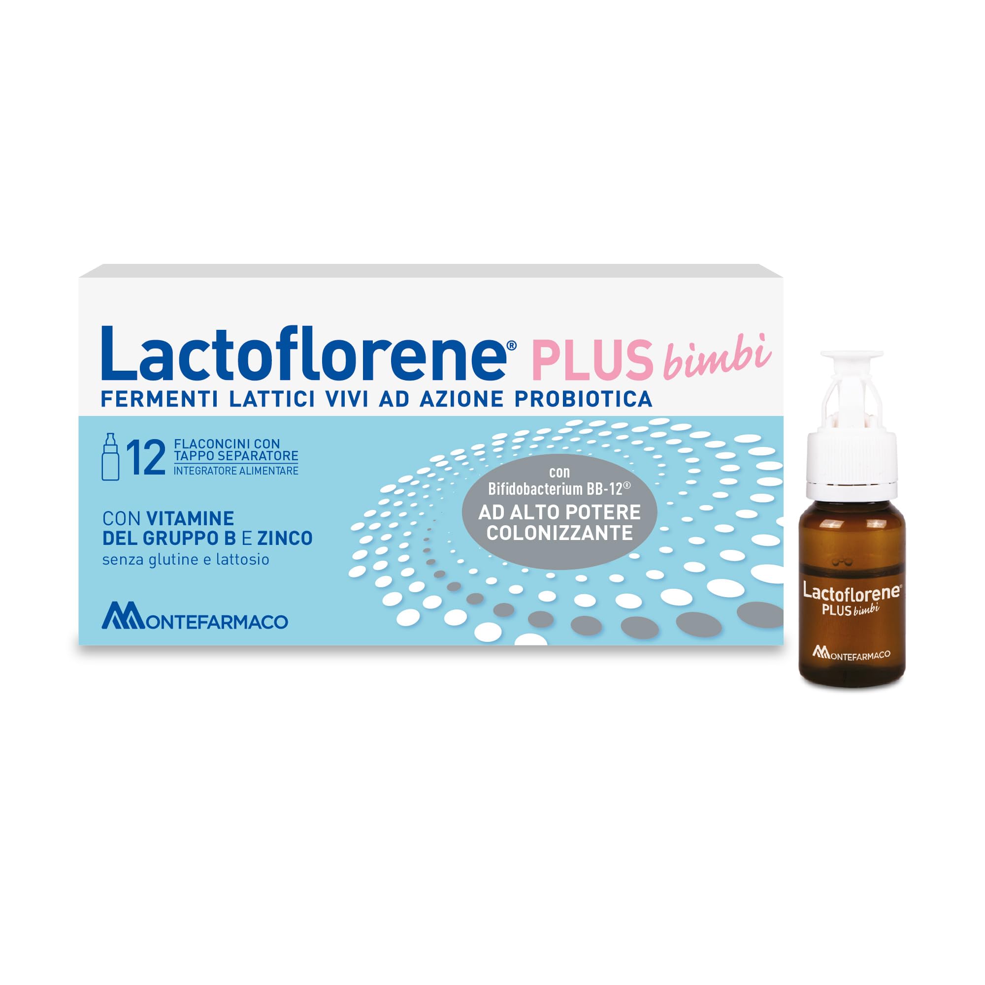 LACTOFLORENE Plus Bimbi, Ferments Lactiques, Probiotiques, Sans Gluten Sans Lactose - Suppléments Enfants avec Probiotiques, Zinc, Vitamine B pour l'équilibre de la flore intestinale (12 flacons)