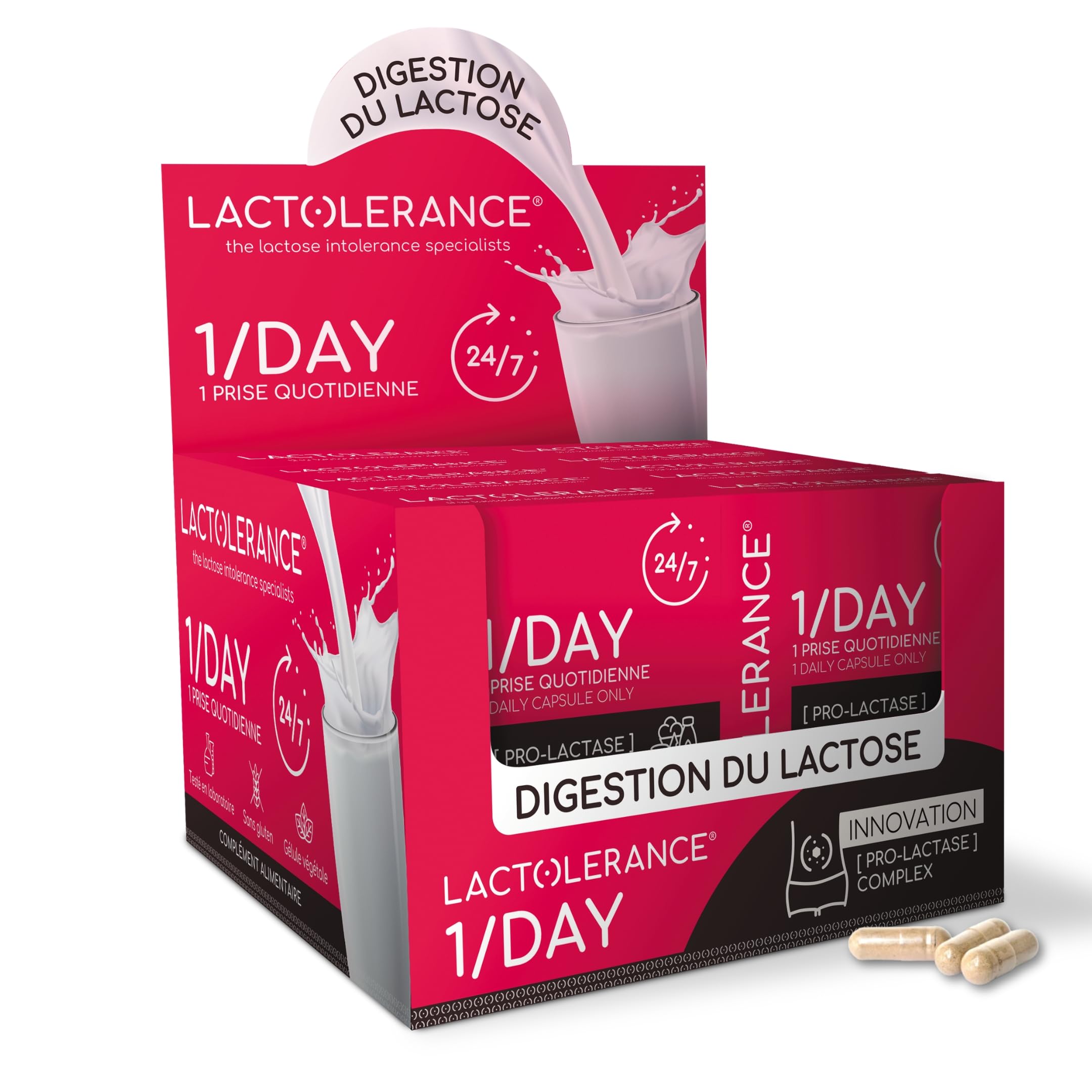 THE LACTOLERANCE RANGE: Created in 2010 by someone with lactose intolerance for people with lactose intolerance, the LACTOLERANCE range helps you regain dietary freedom by reducing digestive discomfort. DIRECTIONS: Take 1 capsule daily with a glass of water. This product is suitable for children aged 6 and up. Vegan, it is formulated without preservatives, gluten, or allergens. Can be used in combination with LACTOLERANCE 9000. 24 7 PROTECTION: This daily food supplement offers continuous protection against lactose intolerance. No more risk of being caught off guard by hidden lactose! WHAT IS LACTASE?: Lactase is a digestive enzyme involved in the breakdown and digestion of lactose (milk sugar). LACTOSE DIGESTION AID: Designed for people with lactose intolerance, LACTOLERANCE 1 DAY consists of lactic acid bacteria that produce lactase to improve daily lactose digestion.