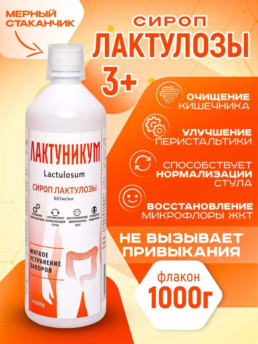 Лактуникум, сироп лактулозы 667 мг/мл, слабительное, кишечный детокс 1000 гСироп лактулозы способствует нормализации стула и улучшению перистальтики, очищению кишечника, востановлению микрофлоры ЖКТ и мягкому устронению запоров. А так же имеет прочие полезные свойства: 1. Активизирует бифидобактерии.2. Улучшает всасывание минералов. 3. Активизирует работу печени. 4. Борется с канцерогенами и токсинами. 5. Лечит запоры. 6. Влияет на образование желчных кислот.