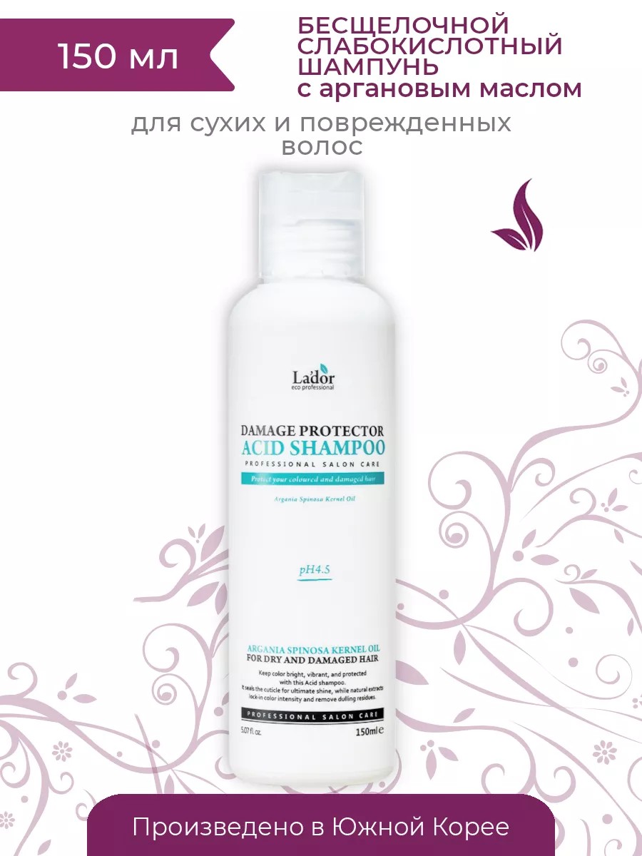 Lador Damage Protector Acid Shampoo - это мягкий шампунь двойного действия с аргановым маслом рекомендован для сухих, ослабленных и поврежденных волос. Также подходит для устранения и предотвращения появления перхоти. Он очищает волосы и способствует восстановлению волосяных чешуек. Шампунь эффективно восстанавливает кислотно-щелочной баланс, так как обладает рН 4.5, и надежно защищает интенсивность цвета ваших локонов, предотвращая вымывание окрашивающих пигментов из кортекса волос. Сохраняет стойкость цвета и рекомендован для ежедневного применения окрашенных волос. Хорошо распутывает и разглаживает волосы. Обладает легким цветочным ароматом. Использование: Нанести небольшое количество шампуня на влажные волосы, помассировать 3-4мин, затем смыть теплой водой.