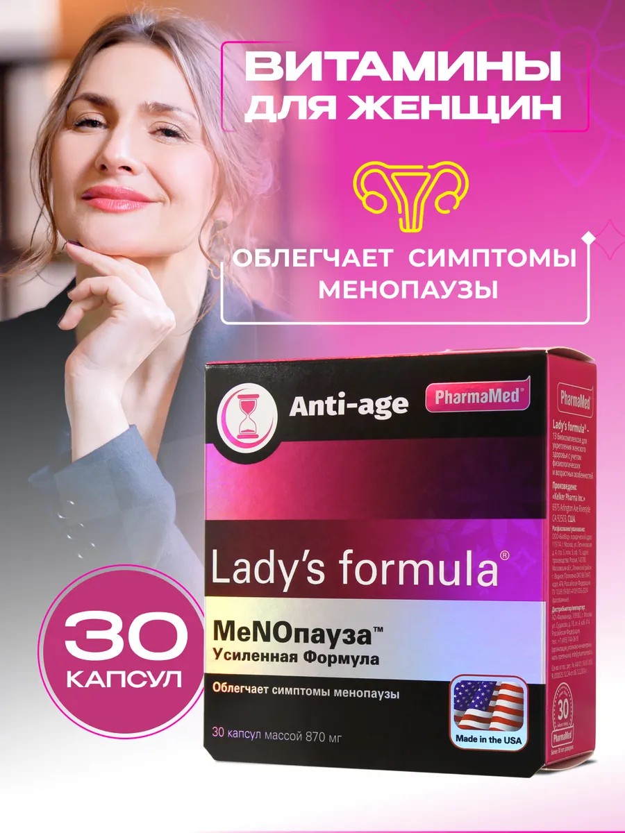Женские витамины Лейдис формула Менопауза усиленная формула - это формула для тех, кто ищет альтернативные пути гормонозаместительной терапии. Леди формула Витамины для женщин Снижает частоту и выраженность приливов.У меньшает раздражительность и частую смену настроения. Снижает риск развития остеопороза и сердечно-сосудистых заболеваний. Устраняет сухость влагалища. Рекомендуется в качестве: БАД к пище для женщин в период менопаузы -дополнительного источника витаминов В1, В2, В6, Е, ниацина, пантотеновой кислоты, фолиевой кислоты, селена, магния, бора, марганца.