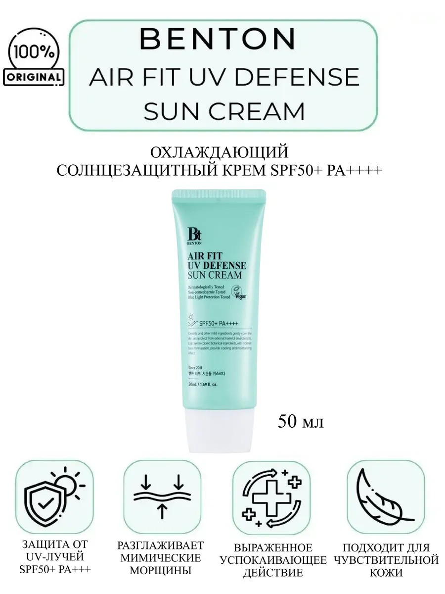 Охлаждающий солнцезащитный крем Benton спф Air Fit UV Defense Sun Cream SPF50+ PA++++ подходит даже для самой чувствительной кожи, обладает выраженным успокаивающим действием, снимает зуд и раздражения после долгого пребывания на солнце.