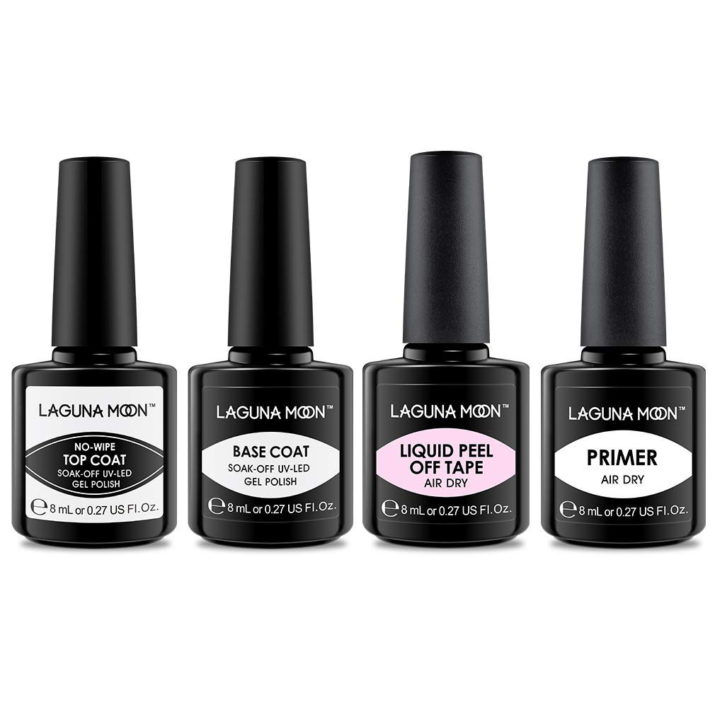 LagunaMoon Gel Nail Polish 4pcs Gel Base and Top Coat Nail Primer for UV/LED Gel Polish Liquid Latex Peel off Tape Cuticle Guard Polish 8ML Complete technical set: Primer + Base Coat + Top Coat + Liquid Tape