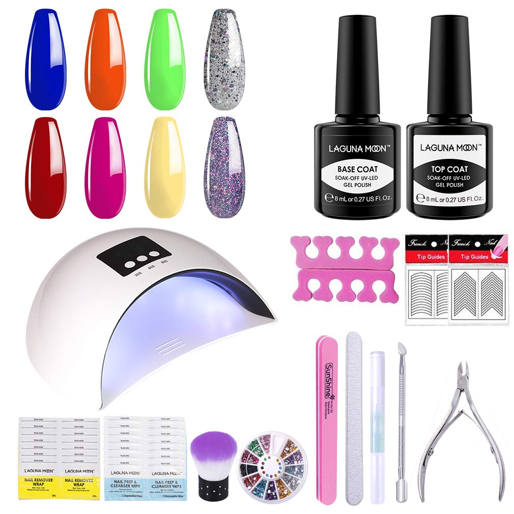 Scope of delivery: 8 x gel nail polish. 1 x 36 W nail lamp. 1 x shiny top coat. 1 x matt top coat. 1 x lower varnish. 1 x nail brush. 1 x nail shaver. 2 x nail files. 1 x clipper. 20 x nail remover wraps. 20 x nail cleaning towels. 1 x Footless nail towels, 400 pieces 1 x rhinestones. Instructions for attaching: Step 1: File your nails, remove the cuticle from your nails.Dry and clean your nails, make sure your nails are oil -free. Step 2: Apply the lower varnish and harden it with an LED or UV nail lamp. Step 3: Apply the first thin layer of paint and harden it under the nail lamp. Step 4: Apply a second thin layer of color and harden it under the nail lamp (some light colors may have to be applied 3–4 layers). Step 5: Apply the top coat and have it hardened. Step 6: Wipe the sticky surface with the cotton wool that is soaked in cleaners. Distance: Step 1: Submit the gel overlack and grate it away.(Important) Step 2: Confirm the nails in gel nail polish remover.(More convenient than gel nail polish remover fluid.) Step 3: Gently replace the entire gel layer from each individual nail. Step 4: Apply some nail skin oil if necessary. Tips: Avoid slightly pulling off. 1. Remember to cover the nail edge when you apply the color gel. 2. Remove the cuticle, cut the edge, polish your nails and make sure that you are dry and clean. 3. We cannot stick the nail polish on the skin or cuticle, otherwise it easily replaces. 4. Do not apply a topp or overpatient and the thinner, the better, otherwise the gel will be shrinked and detached. Nail drying time First check the wattage of your lamp. Let the base varnish harden for 30 seconds. Having the gel nail polish per layer for 60 seconds. Have a custody of the cover lacquer for 60 seconds. Wipe off with a cotton ball soaked in alcohol.International Products have separate term, are from abroad and may differ from local products, included fit, age ratings, and language of product, labeling or instructions.Perfect gift idea: This easy-to-use gel-nail starter set offers you everything you need to achieve the perfect manic in salon quality at home.It is a perfect gift for girlfriends, may and sisters who are suitable for most occasions: birthday, Mother's Day, Christmas, Valentine's Day, Thanksgiving.Safe materials: The gel nail polish set contains 6 trendy nude and bling colors without aggressive ingredients or adhesives that can be found in the same way, ideal for salon and home use.User-friendly design: Our 36 W UV LED nail lamp with 3 timer settings: 30 s, 60 s, 90 s for your stated selection, light, portable and easy to clean.Almost all of the nail gel: including LED gels, UV-Gels, hard n gel, assembly gel, nail, nail gel, nail sculpture gel, gemstone angel, LED nail angel, polygel and other gel.All-in-one kit Agunamoon gel nail set contained with UV lamp: 8 gel nail polish colors of the summer series 1 x 36-W nail lamp, 1 x wipe-free gloss Berlack 1 x gel sublack 1 x nail lifting, 1 x nail shaver, 2 x nail cutters, 1 x nail remover wrap, 30 x 4-way cloth.1 x buffer block.1 Franz Sian sticker, 380 cotton pads.Lieferumfang: 8 x Gel-Nagellack. 1 x 36-W-Nagellampe. 1 x glänzender Überlack. 1 x matter Überlack. 1 x Unterlack. 1 x Nagelbürste. 1 x Nagelhautschieber. 2 x Nagelfeile. 1 x Schermaschine. 20 x Nagelentferner-Wraps. 20 x Nagelreinigungstücher. 1 x Fusselfreie Nageltücher, 400 Stück 1 x Strasssteine. Anleitung zur Anbringung: Schritt 1: Feilen Sie Ihre Nägel, entfernen Sie die Nagelhaut von Ihren Nägeln. Trocknen und reinigen Sie Ihre Nägel, stellen Sie sicher, dass Ihre Nägel ölfrei sind. Schritt 2: Tragen Sie den Unterlack auf und härten Sie ihn mit einer LED- oder UV-Nagellampe aus. Schritt 3: Tragen Sie die erste dünne Farbschicht auf und härten Sie sie unter der Nagellampe aus. Schritt 4: Tragen Sie eine zweite dünne Farbschicht auf und härten Sie sie unter der Nagellampe aus (einige helle Farben müssen möglicherweise 3–4 Schichten aufgetragen werden). Schritt 5: Tragen Sie den Überlack auf und lassen Sie ihn aushärten. Schritt 6: Klebrige Oberfläche mit in Reiniger getränkter Watte abwischen. Entfernung: Schritt 1: Tragen Sie den Gel-Überlack ab und raspeln Sie ihn weg. (Wichtig) Schritt 2: Die Nägel ca. 5 Minuten in Gel-Nagellackentferner einweichen. (Bequemer als Gel-Nagellackentfernerflüssigkeit.) Schritt 3: Die gesamte Gelschicht von jedem einzelnen Nagel sanft ablösen. Schritt 4: Tragen Sie bei Bedarf etwas Nagelhautöl auf. Tipps: Vermeiden Sie es, sich leicht abzuziehen. 1. Denken Sie daran, die Nagelkante zu bedecken, wenn Sie das Farbgel auftragen. 2. Entfernen Sie die Nagelhaut, schneiden Sie den Rand, polieren Sie Ihre Nägel und stellen Sie sicher, dass sie trocken und sauber sind. 3. Wir können den Nagellack nicht auf Haut oder Nagelhaut kleben, da er sonst leicht ablöst. 4. Tragen Sie keinen Überlack oder Überlack auf und je dünner, desto besser, sonst wird das Gel schrumpft und abgelöst. Nageltrocknerzeit Überprüfen Sie zuerst die Wattleistung Ihrer Lampe. Lassen Sie den Basislack für 30 Sekunden aushärten. Gel-Nagellack pro Schicht 60 Sekunden aushärten lassen. Decklack 60 Sekunden aushärten lassen. Mit einem in Alkohol getränkten Wattebausch abwischen.International products have separate terms, are sold from abroad and may differ from local products, including fit, age ratings, and language of product, labeling or instructions. Perfekte Geschenkidee: Dieses einfach zu verwendende Gel-Nagel-Starter-Set bietet Ihnen alles, was Sie brauchen, um die perfekte Manikre in Salonqualitt zu Hause zu erreichen. Es ist ein perfektes Geschenk fr Freundinnen, Mtter und Schwestern, die fr die meisten Anlsse geeignet sind: Geburtstag, Muttertag, Weihnachten, Valentinstag, Thanksgiving. Sichere Materialien: Das Gel-Nagellack-Set enthlt 6 trendige Nude- und Bling-Farben ohne aggressive Inhaltsstoffe oder Klebstoffe, die zu beschdigten Ngeln fhren, ideal fr den Salon und den Heimgebrauch. Benutzerfreu