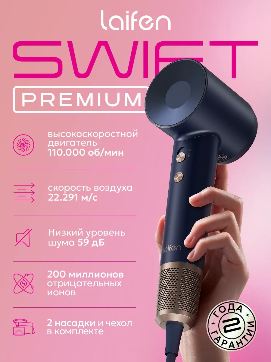 Фен Laifen Swift Premium с пластиковым корпусом цвета «белое золото» оснащен EC-мотором 1600 Вт. Доступны четыре температурных режима. Воздушный поток можно регулировать, максимальная скорость — 22 м/сек. Доступны функция подачи холодного воздуха и ионизация. Двигатель прикрывает съемная защитная решетка. При перегреве прибор отключается. В комплект входят чехол и насадка-диффузор. Для подключения к розетке предусмотрен сетевой шнур 1,8 м. Размеры — 36,5х15,3х18,8 см, вес — 407 г.
