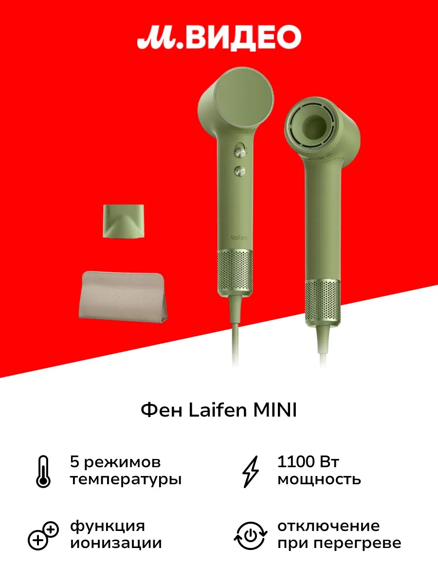 Фен Laifen Mini Green - компактная модель, которая весит всего 299 г. Особая конструкция со смещенным в сторону удлиненной рукоятки центром тяжести позволяет уменьшить нагрузку на запястье и уменьшить усталость во время длительной работы с волосами. • DC-мотор мощностью 1100 Вт Вращается со скоростью 110000 об/мин и создает воздушный поток силой до 19 м/с. Благодаря особой конструкции снижен уровень шума - он не превышает 61 дБ. • Пять температурных режимов и две скорости потока Можно выбрать теплый или горячий воздух для сушки и укладки, холодный для закрепления результата или попеременный для особенно щадящего воздействия на волосы (горячий и холодной поток подаются на 2 секунды). Доступен также детский режим - адаптирован для мягких волос. • Ионизация В процессе работы приборов выделяется 200 млн ионов, который нейтрализуют статическое электричество, придают волосами гладкость и блеск. В комплекте с феном поставляется концентратор шириной 50 мм. Он создает более точно направленный воздушный поток, что пригодится для укладки брашингом, придания прикорневого объема, проработки отдельных прядей. Насадка фиксируется при помощи магнитного крепления - это быстро и удобно.