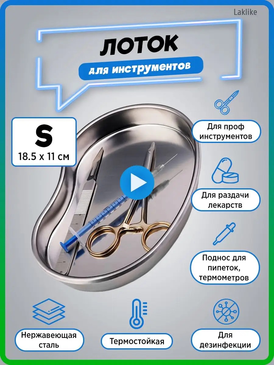 Лоток медицинский металлический имеет размеры: маленький - 18.5х11х2.5 см.