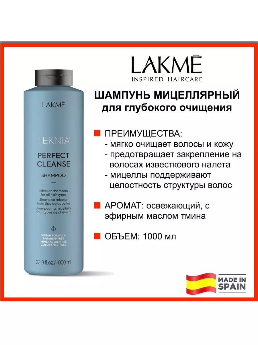 Мицеллярный шампунь PERFECT CLEANSE из линии TEKNIA от Lakme (Испания) глубоко и мягко очищает волосы и кожу головы. Мицеллы улавливают загрязнения, не повреждая волокна волос. Шампунь оказывает действие, направленное на выведение токсинов. Предотвращает закрепление на волосах известкового налета при мытье водой. Формула обогащена сочетанием фруктовых кислот Средиземноморья, извлеченных из лимона, красного винограда и яблок, которые действуют на трех уровнях: выведение токсинов, защита от известкового налета и естественное увлажнение. VEGAN FORMULA - PARABEN-FREE - MINERAL OIL-FREE - COLORANTS-FREE.Применение: Нанести на влажные волосы. Тщательно смыть водой. Пластиковая упаковка шампуня для глубокого очищения волос является экологически чистой и изготовлена из этанола, получаемого из бразильского сахарного тростника. TEKNIA - бренд эффективных и натуральных веганских средств для ухода за волосами от Lakme.