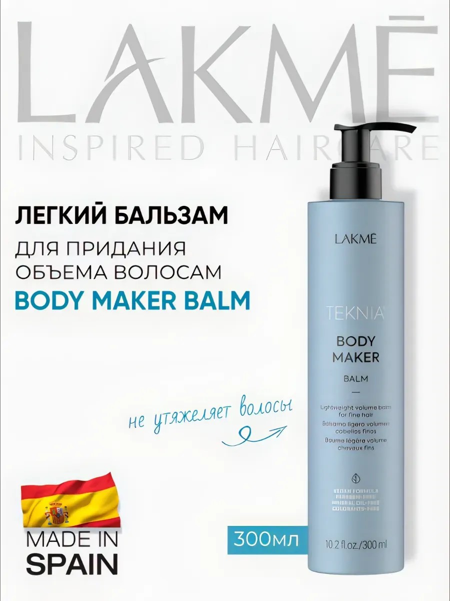 LAKME TEKNIA NEW! BODY MAKER - это легкий бальзам для придания объема вашим волосам. Объемные и здоровые волосы — мечта каждой женщины, и данный продукт поможет вам в этом. Специально разработанная формула бальзама разрушает сглаживающие эффекты, позволяя вашим локонам выглядеть пышными и живыми. Он легко распределяется по волосам, не утяжеляя их, что делает его идеальным для ежедневного использования.