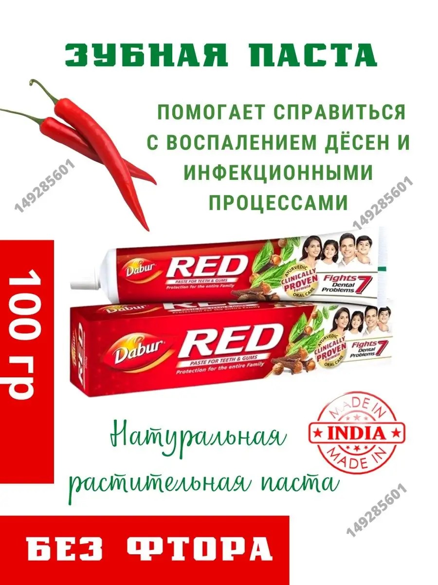 СРОК ДО 08.2024 Dabur Red Индийская зубная паста Аюрведическая Индийская зубная паста с черным перцем и перцем пиппали. Dabur Red - Аюрведическая классика по уходу за полостью рта. Самая популярная зубная паста в Индии. Естественные компоненты - гвоздика, мята, имбирь освежают дыхание. Травы, обладающие вяжущими свойствами, излечивают десны, поэтому зубная паста Dabur RED - хорошая профилактика кровоточивости десен. Применение зубной пасты Dabur Red обеспечит укрепление зубной эмали.**Зубная паста Ред:** каждые 100 г пасты содержат растительные экстракты (Herbal extract) - 2.5%, w/w, полученные из: Чёрный перец (Piper nigrum) - 31.04 г, Пиппали (Piper longum) - 31.04 г, Имбирь (Zingiber officinale) - 31.04 г. Зантоксилум (Zanthoxylum armatum) - 31.04 г, Гвоздика (Syzygium aromaticum) - 0.50 г. Коричник камфорный (Cinnamomum camphora) - 0.50 г, Мята перечная (Mentha piperita) - 0.50 г, Ласуна (Allium sativum) - 1.80 г Натрия бензоат.Паста не содержит ФТОР