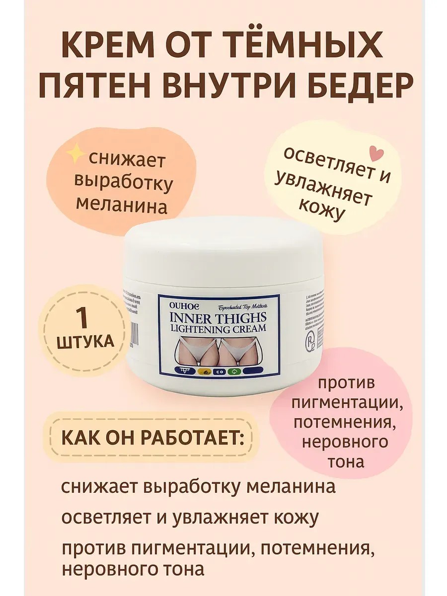 В упаковке одна штука. Крем OUHOE предназначен для осветления кожи на внутренней стороне бёдер, коленях, подмышках и других участках с выраженным потемнением. Он помогает эффективно убрать тёмные пятна, выровнять тон кожи и улучшить её общее состояние. В составе активные компоненты: транексамовая кислота, экстракт солодки, сандаловое дерево, глицерин, масло ши — они увлажняют, питают и осветляют кожу, не вызывая раздражения. Крем от пигментации, отбеливающий крем от тёмных пятен, осветляющий крем для тела, крем против потемнений кожи, отбеливающий крем для бёдер — это всё про OUHOE. Благодаря лёгкой текстуре средство быстро впитывается и не оставляет липкости. Не содержит парабенов и подходит для регулярного применения. Используйте дважды в день, чтобы добиться максимального результата. Объём 60 г, удобная баночка, приятный аромат и экономичный расход делают этот крем отличным выбором для ухода за тёмной кожей.