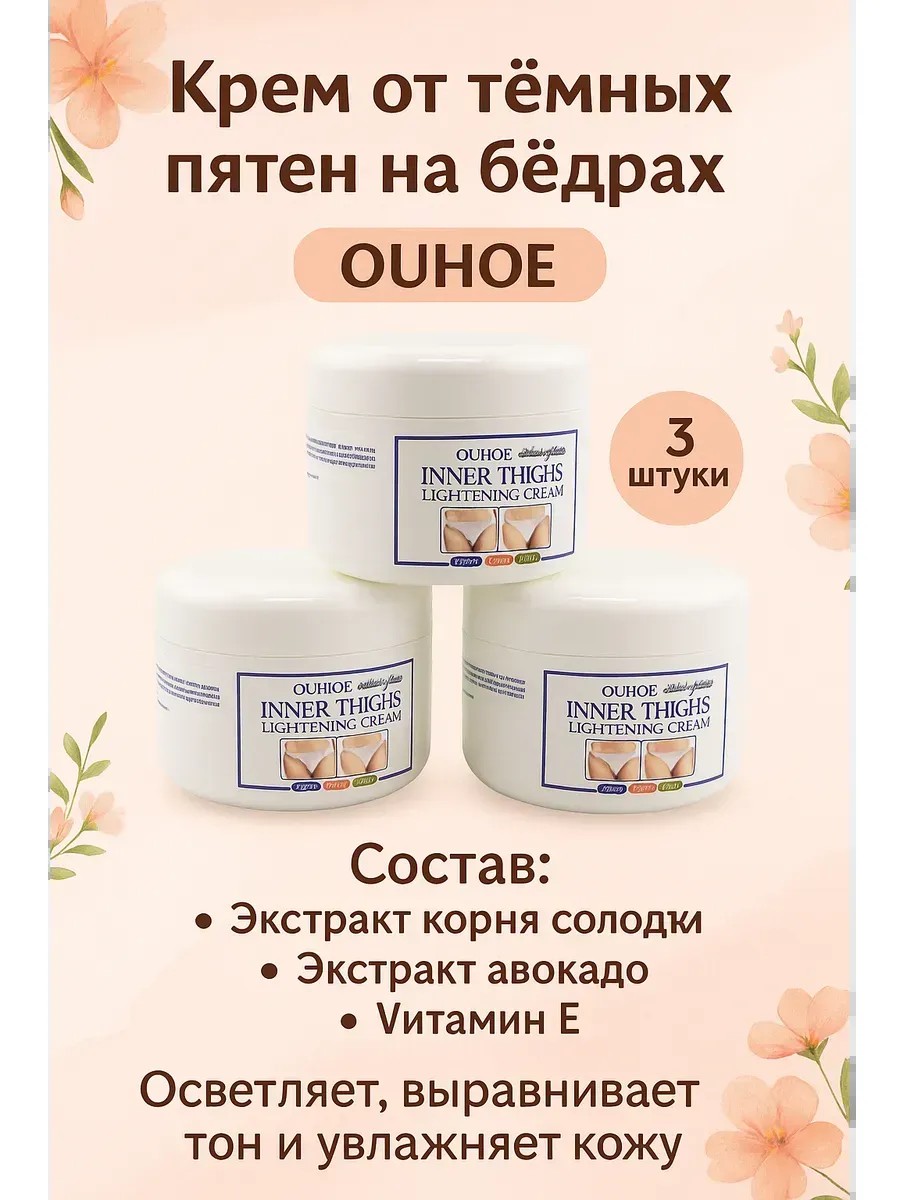 OUHOE — это надёжное средство для ухода за тёмными участками кожи. Он помогает выравнивать тон, борется с пигментацией и делает кожу более гладкой и ухоженной. Крем мягко воздействует на проблемные зоны: внутреннюю поверхность бёдер, подмышки, зону бикини и локти. В составе присутствуют активные компоненты, такие как койевая кислота, экстракты корня солодки и сандала, витамин Е и масло авокадо. Эти ингредиенты не только осветляют кожу, но и питают, увлажняют и защищают её. Крем быстро впитывается, не оставляет следов и подходит для ежедневного применения. Средство можно использовать в домашнем уходе, оно не требует особых условий и легко наносится. Подходит для всех типов кожи, включая чувствительную. Упаковка содержит 3 баночки по 60 мл, что обеспечивает длительное использование. Общий объём — 180 мл. Только для наружного применения. Не допускать попадания в глаза и на раздражённую кожу. При появлении нежелательной реакции следует прекратить использование. Хранить при температуре не выше +25 °C, вдали от солнечного света и детей. Продукт сочетает природные компоненты и современные технологии, помогая коже выглядеть заметно светлее и здоровее уже через несколько недель применения.