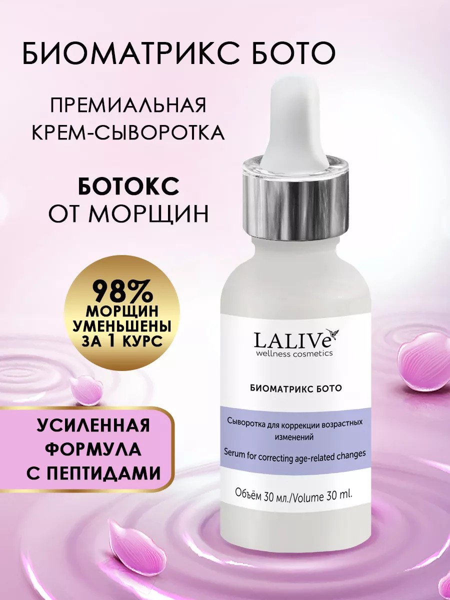 Visibly reduce wrinkles in just one month! Looking for high-quality rejuvenating facial care? We present the Biomatrix Boto peptide cream serum, a booster to combat age-related changes. This effective facial care product boasts a potent formula. With this product, you can visibly reduce the depth of wrinkles in just one treatment, as well as prevent the appearance of new ones, while your skin regains its youthful radiance! Rich ingredients: Argireline peptide, Collagen, Elastin, Vitamin C, Hyaluronic Acid (in the LIPOSENTOL complex), Jojoba and Wheat Germ oils for deep hydration and nourishment. Wrinkle control: this facial serum reduces the depth of wrinkles and prevents the appearance of new ones. ARGIRELINE, an innovative peptide filler, is an alternative to Botox. It relaxes facial muscles and reduces wrinkles. Anti-aging effect: COLLAGEN and ELASTIN increase elasticity, create a lifting effect, and slow down aging. Light texture: quickly absorbed and suitable as a makeup base. Economical: 30 ml is enough for a course of treatment. For all skin types. Especially good as facial care for aging, dry, and sensitive skin. Beautiful packaging: a perfect gift for yourself, mom, girlfriend, colleague, or mother-in-law. Can be added to a cosmetic gift set. Created in Russia using only natural ingredients. The quality of the composition is on par with European or Korean cosmetics. Application: Apply to cleansed skin morning and evening before using the main cream, emulsion, or essence. Course duration: 30-45 days. Suitable for use with: gua sha, tapes, microcurrents, darsonval. For rejuvenating correction, use after: RF (SMAS SMAS) lifting, carboxytherapy, mesoroller. For mature, aging skin ages 30+, 35+, 40+, 45+, 50+, 55+, 60+. Suitable for pregnant and nursing mothers, before and after childbirth, for both men and women, as day and night care. LALIVe is Russian cosmetics made according to GOST standards. We are a direct manufacturer and supplier to Wildberries. Only original products and quality certificates.