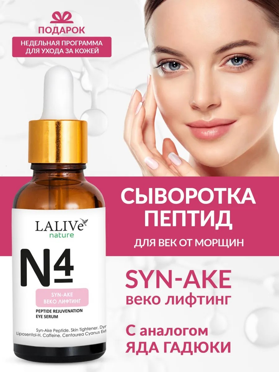 Столкнулись с проблемами, такими как опущенные уголки век, гусиные лапки, отеки и темные круги под глазами? Антивозрастная сыворотка «N4 Веко Лифтинг» станет вашим надежным помощником в решении этих неприятностей! Основа эсенции - пептид SYN-AKE, аналог яда гадюки, натуральная замена уколам красоты без боли для возрастной кожи. Действует подобно ботокс botox филлеру: мягко расслабляет мышцы, сокращает глубину и длину мимических морщин в области глаз. Уходовая косметика для лица с пептидами – доказанный клинически эффективный подход к омоложению: подтягивает кожу вокруг глаз, повышает упругость, стимулирует выработку коллагена и эластина. Также лифтинг сыворотка от морщин содержит: 1. Кофеин - уменьшает отеки, мешки и темные круги под глазами. 2. Лифтинг Активы: Skin Tightener (бурые водоросли) и Диналифт в комплексе разглаживают и подтягивают кожу век. 3. 4D-Гиалуроновая Кислота, Липосентол-Н (увлажняющий комплекс) и Экстракт Василька обеспечивают насыщение кожи влагой и сияющий вид. 4. Сок Сорго оказывает долговременный эффект разглаживания складок в области глаз. 5. Пантенол интенсивно устраняет сухость и чувствительность. Подарите себе прекрасный и сияющий взгляд без морщин! ПРИМЕНЕНИЕ: 2 р/день утро/вечер для коррекции морщин, 1-2 р/день в качестве базового ухода. Курс 30-45 дней. При выраженных проблемах увеличить до 60 дней. Быстро впитывается, не липнет и может служить как основа под макияж. Проверено дерматологами. Для омолаживающей коррекции применять после: rf рф ( smas смас ) лифтинг, карбокситерапия и мезороллер. Подходит для всех типов кожи (от 30 до 60 лет), а также безопасна для беременных и кормящих женщин и мужчин. LALIVe — российская косметика, произведенная в строгом соответствии с ГОСТ. Мы являемся прямым производителем и поставщиком на платформе Wildberries. У нас вы найдете только оригинальный товар, который отличается высоким качеством и эффективностью. Откройте для себя мир красоты с LALIVe!