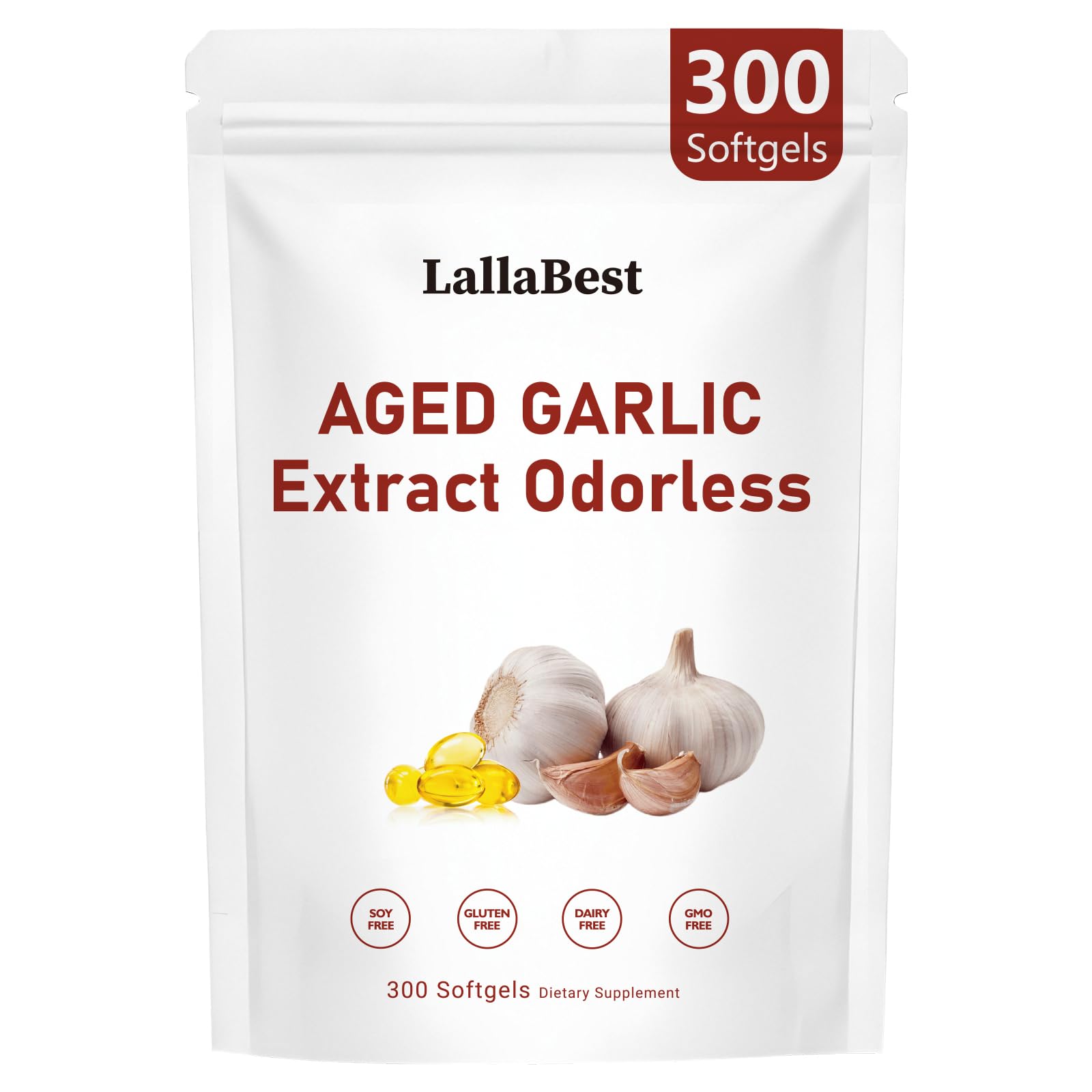 LallaBest 10000mg Aged Garlic Extract Capsules | Non-GMO Gluten-Free | 300 Softgels Odorless Organic Garlic Supplement for Heart & Immune Support | 2 Years Aged Garlic Extract