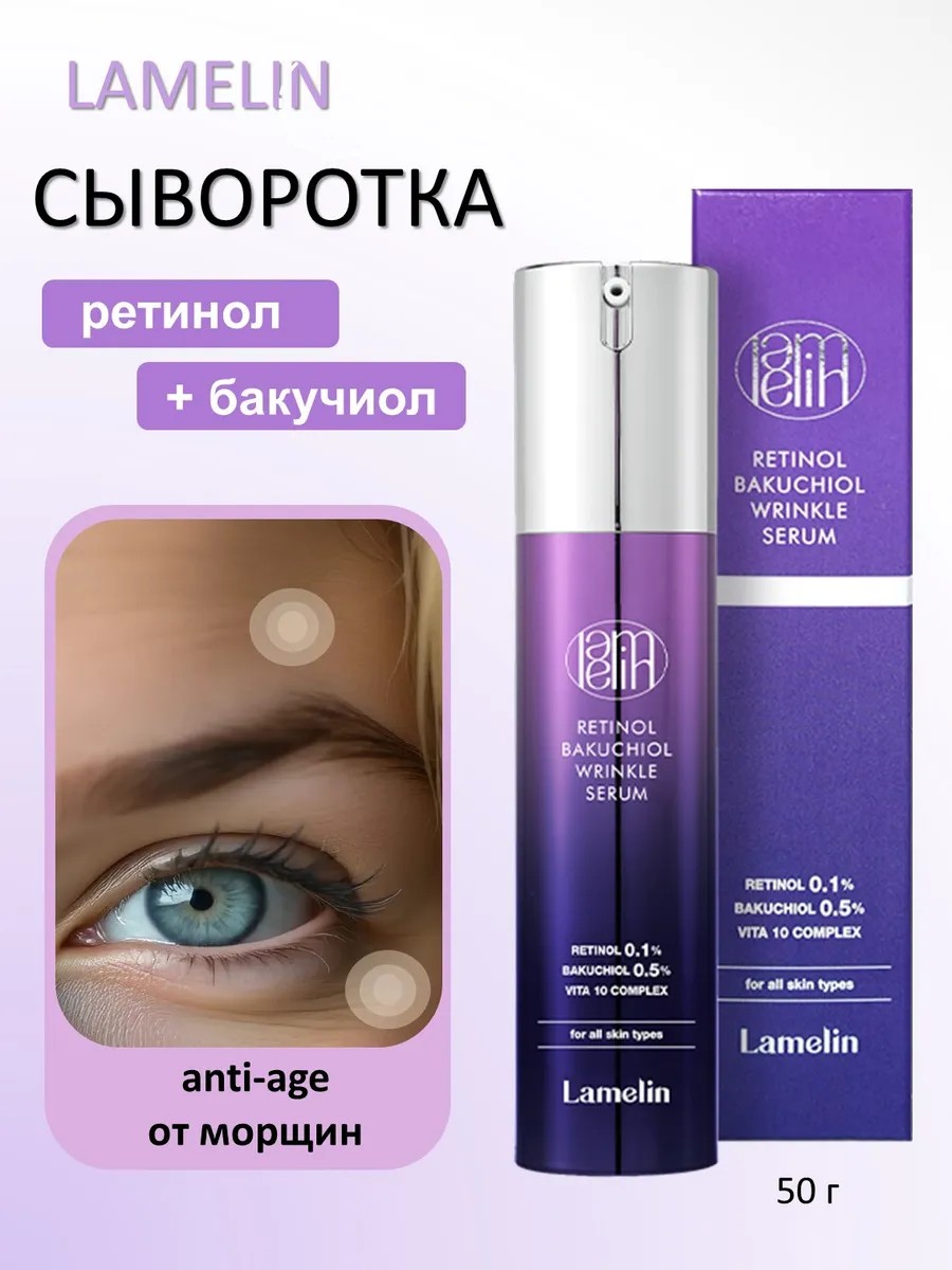 Сыворотка с ретинолом и бакучиолом для лица антивозрастная Retinol Bakuchiol Wrinkle Serum от Lamelin - разглаживает и уплотняет кожу, сокращает морщинки, выравнивает тон и уменьшает видимость пигментных пятен и следов от акне, разглаживает микрорельеф. Содержит 0,5% бакучиола — растительного компонента, который является мягким аналогом ретинола и подходит для чувствительной кожи: стимулирует клеточное обновление, разглаживает, делая кожу нежной и бархатистой. Бакучиол не только разглаживает и повышает упругость, уменьшая выраженность морщин, но и стабилизирует ретинол, усиливая его эффект. 0,1% ретинола в составе так же оказывает антивозрастное действие, улучшая текстуру кожи. Данная концентрация подходит для ежедневного применения для кожи, начиная с 30-35 лет. А также является оптимальной на период привыкания кожи к ретинолу. После постепенного привыкания уже стоит использовать 0,2% ретинола, но для этого вам не нужно покупать новое средство - достаточно начать использовать эту сыворотку серум с 0,1% ретинолом не один, а 2 раза в день (утром и вечером). Также в составе Пантенол (витамин B5) и Ниацинамид (витамин B3). СПОСОБ ПРИМЕНЕНИЯ: Нанести сыворотку на очищенную кожу, распределить по массажным линиям. Средства с ретинолом обязательно наносить только на сухую кожу и сверху "закрывать" увлажняющим кремом. В дневное время наносите солнцезащитный крем. Меры предосторожности: не используйте одновременно с пилингами или скрабами, а также со средствами с AHA, BHA, PHA-кислотами. Не используйте при текущей и планируемой беременности, во время кормления, а также после косметологических процедур. Если вы не использовали ретинол ранее, начинайте с 2 раз в неделю на протяжении 2 недель, далее увеличьте частоту использования. Для выраженного эффекта рекомендуется использовать курсом (2-3 месяца), а затем сделать перерыв (1-2 месяца).