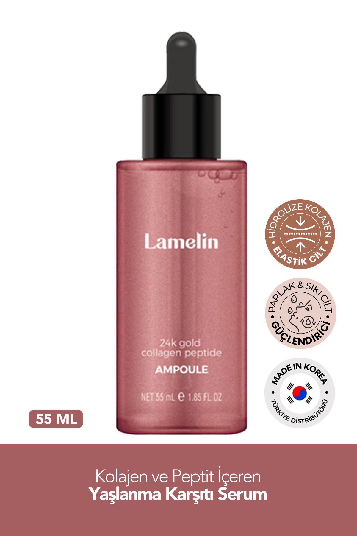 • Anti-aging care serum, enriched with Peptide, Collagen and gold complex, is suitable for daily use and provides firming, anti-wrinkle and revitalizing effects.