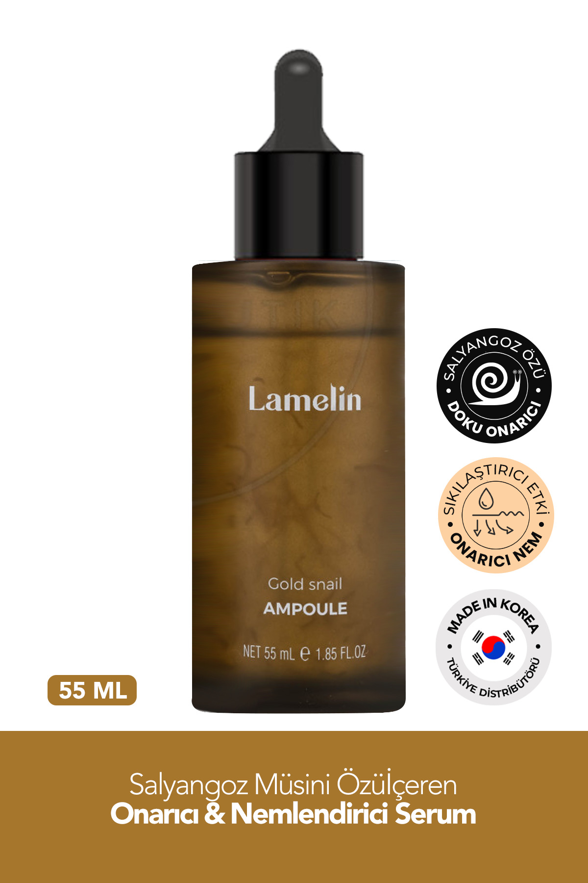 • Salyangoz müsinli onarici yüz serumu Lamelin Altin Salyangoz Ampul 50 ml etkili bir sekilde nemlendirir, su-yag dengesini onarir, cilt yenilenmesini hizlandirir, kirisikliklarin giderilmesine yardimci olur ve cildin sikiligini ve elastikiyetini artirir. Serum hidrolize kolajen içerir. Hidrolize kolajen, dogal kolajen eksikligini giderir, cilt yüzeyinin pürüzsüzlestirilmesine ve kirisikliklarin azaltilmasina yardimci olur.
