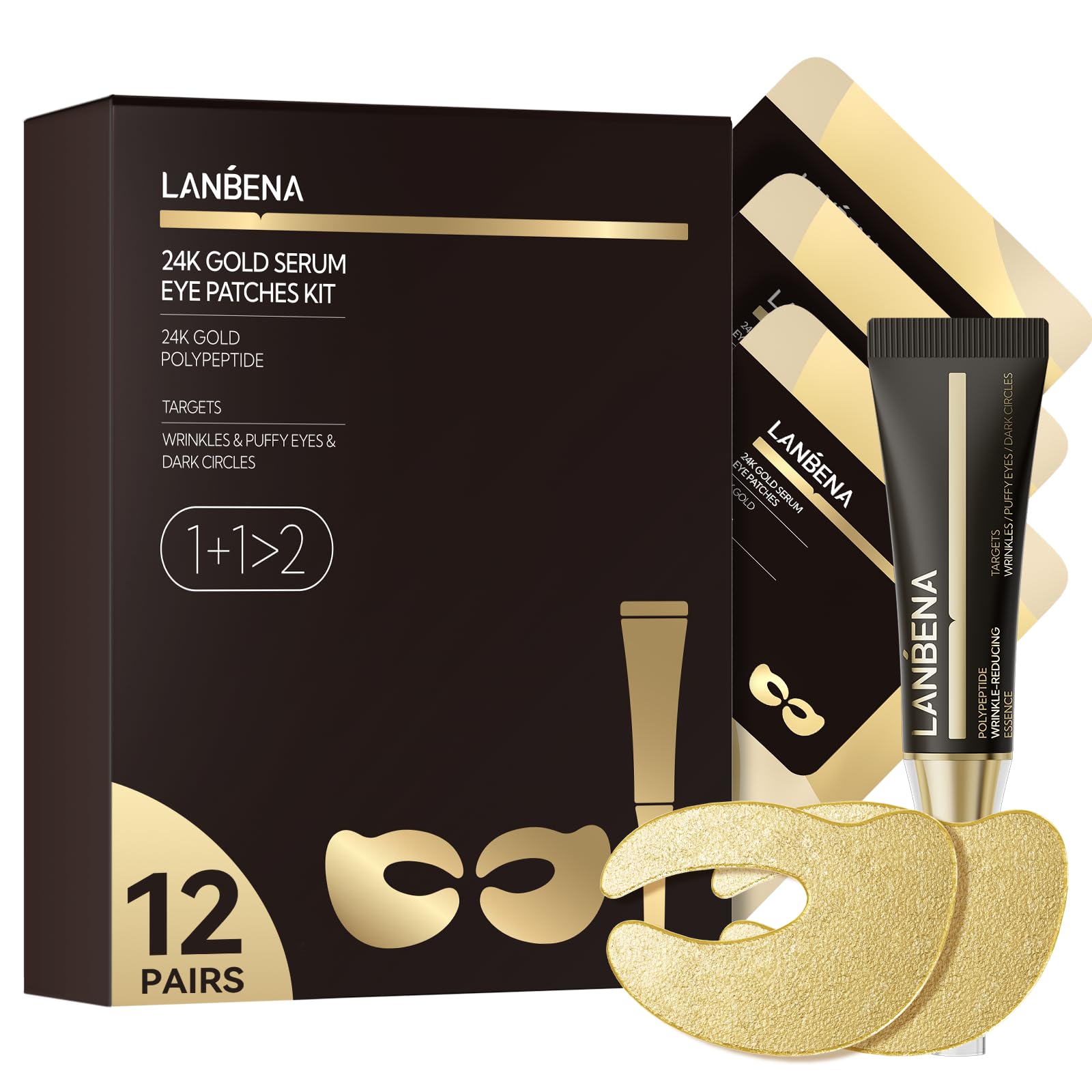LANBENA Patchs Contour des Yeux 24K Or, Essence Réductrice Rapide, Réduit les Poches, Yeux Gonflés, Rides, Cernes et Ridules. Kit de Soins des Yeux (12 Paires, 8 ml) doré