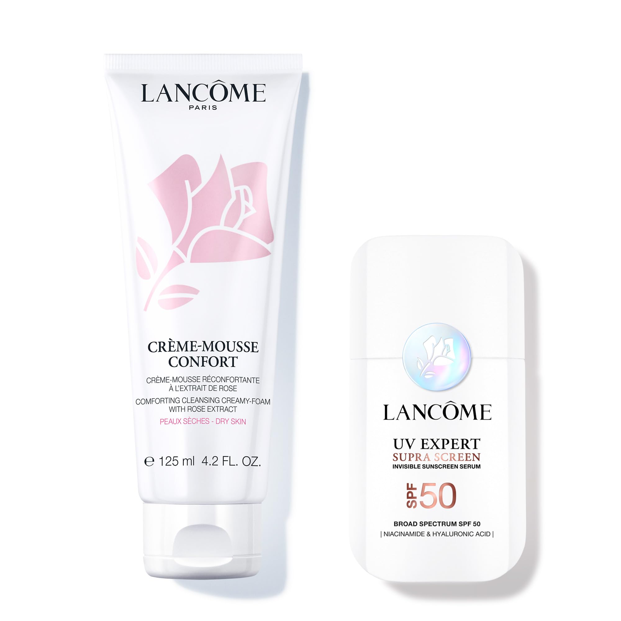 Lanc me Essentials Skincare duo - Cr me Mousse Confort Foaming Facial Cleanser 4.2 Fl Oz & Supra Screen Invisible Serum Sunscreen SPF 50+ - Anti-Aging Correction & Protection