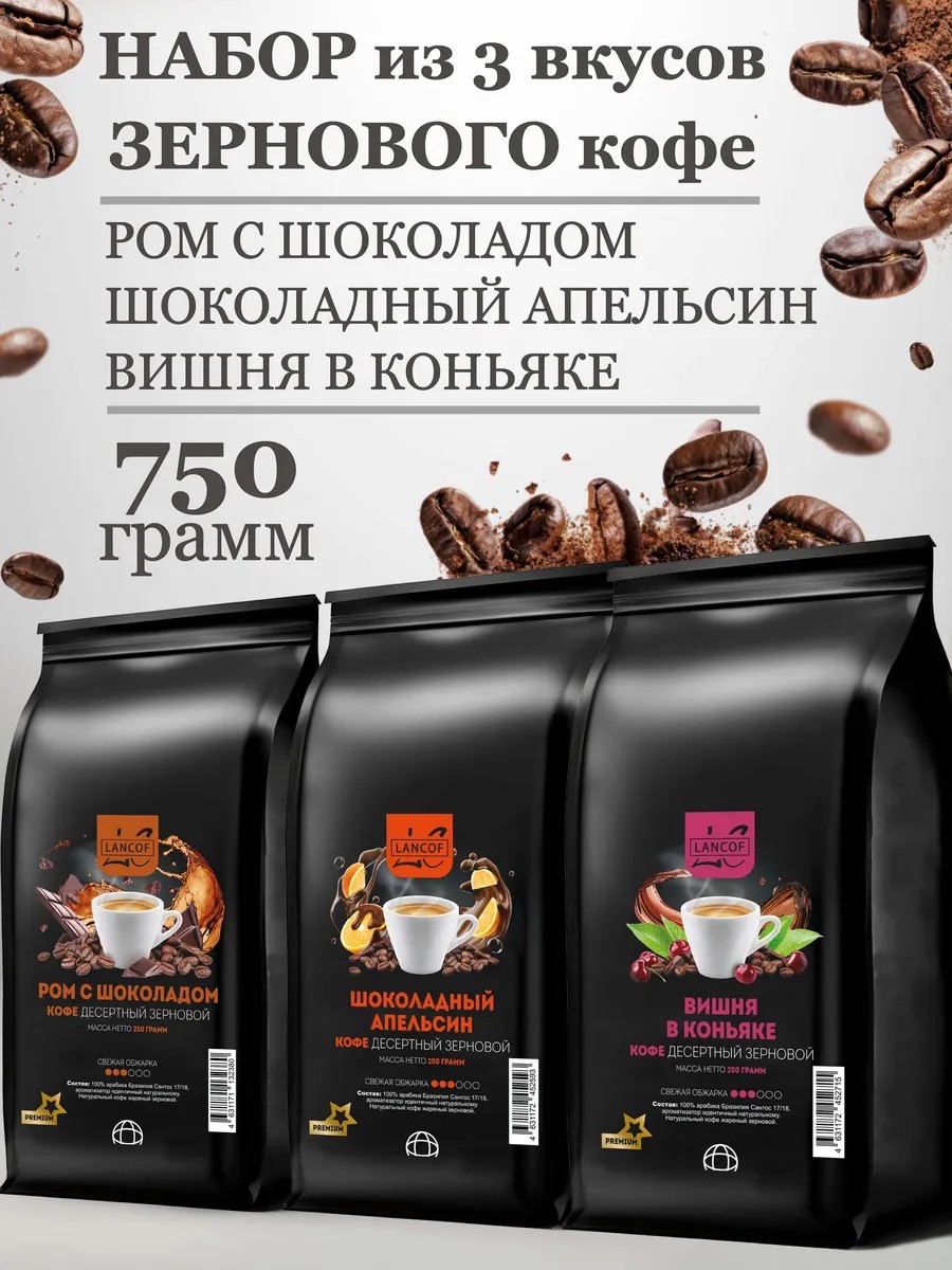 Кофе в зернах 100% арабика ароматизированный набор из 3 упаковок по 250 г со вкусом Ром с шоколадом, Шоколадный апельсин и Вишня в коньяке. Объем 750 гр. Откройте для себя богатство вкусовых нот.