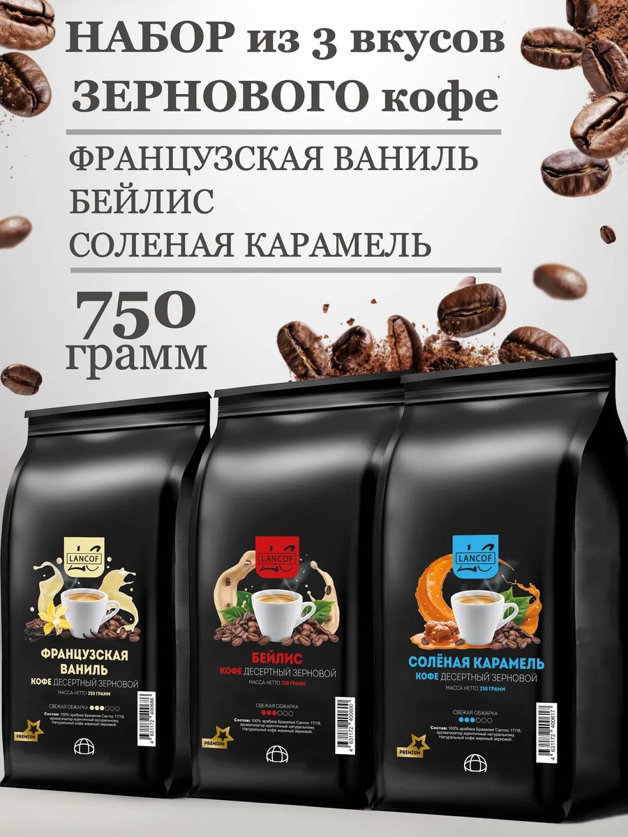 Кофе в зернах 100% арабика ароматизированный набор из 3 упаковок по 250 г со вкусом Французская ваниль, Бейлис и Соленая карамель. Объем 750 гр. Откройте для себя богатство вкусовых нот.