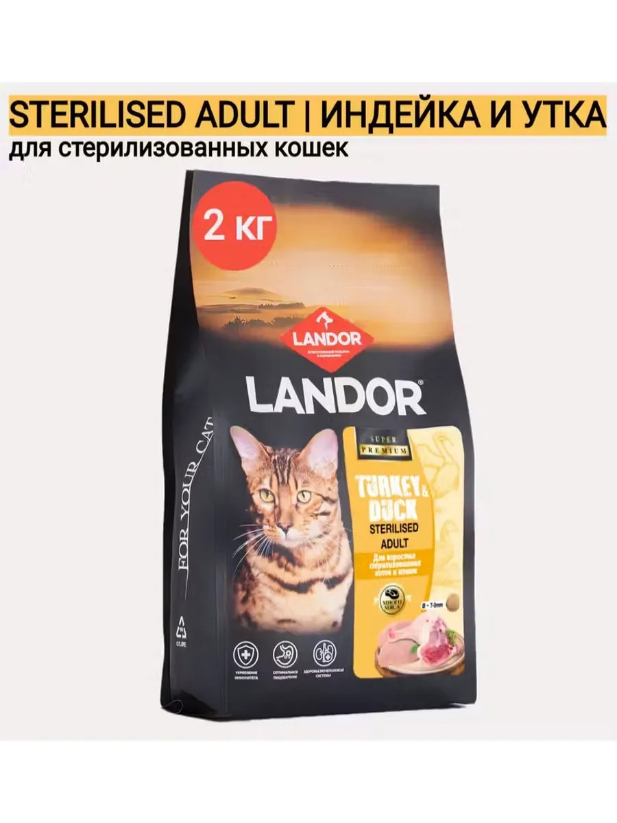 Корм LANDOR для кошек STERILISED ADULT с индейкой и уткой - полнорационный сухой корм, разработан специально для стерилизованных кошек и кастрированных котов, способствует нормализации веса, улучшает пищеварение и укрепляет иммунитет.