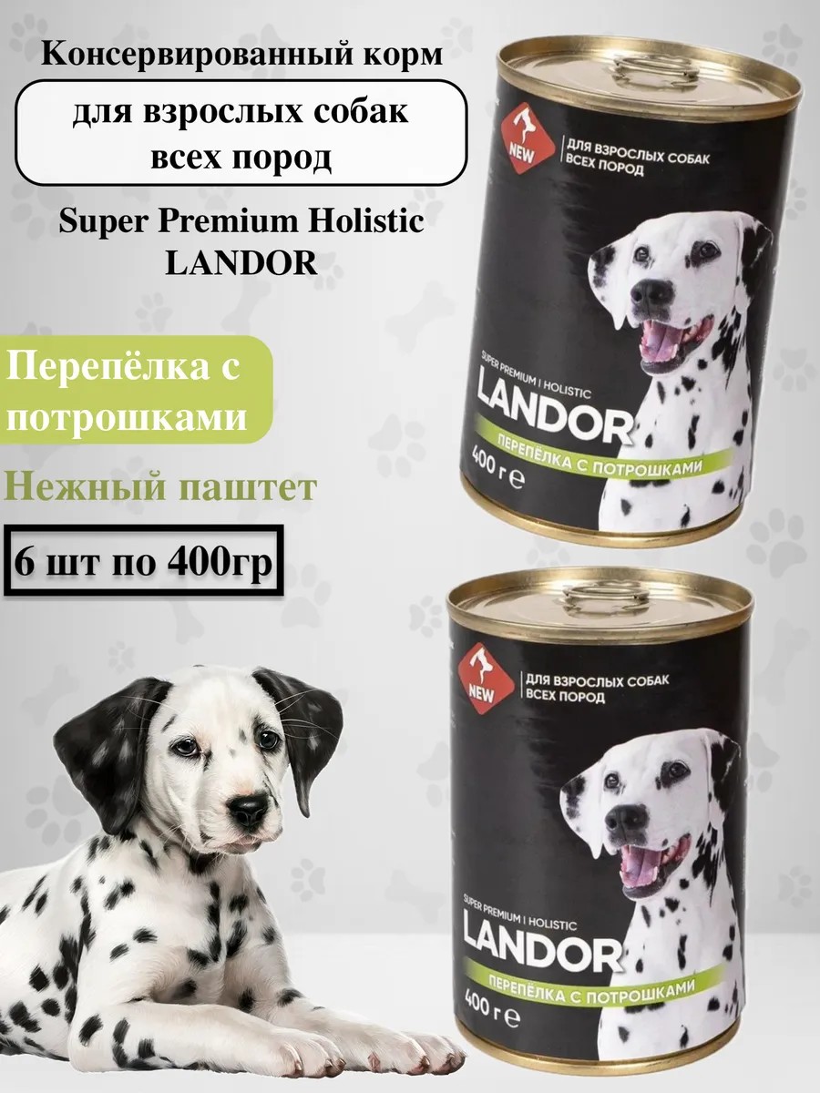 | Комплектация | Консервированный корм для взрослых собак всех пород LANDOR перепёлка с потрошками 6штх400г |