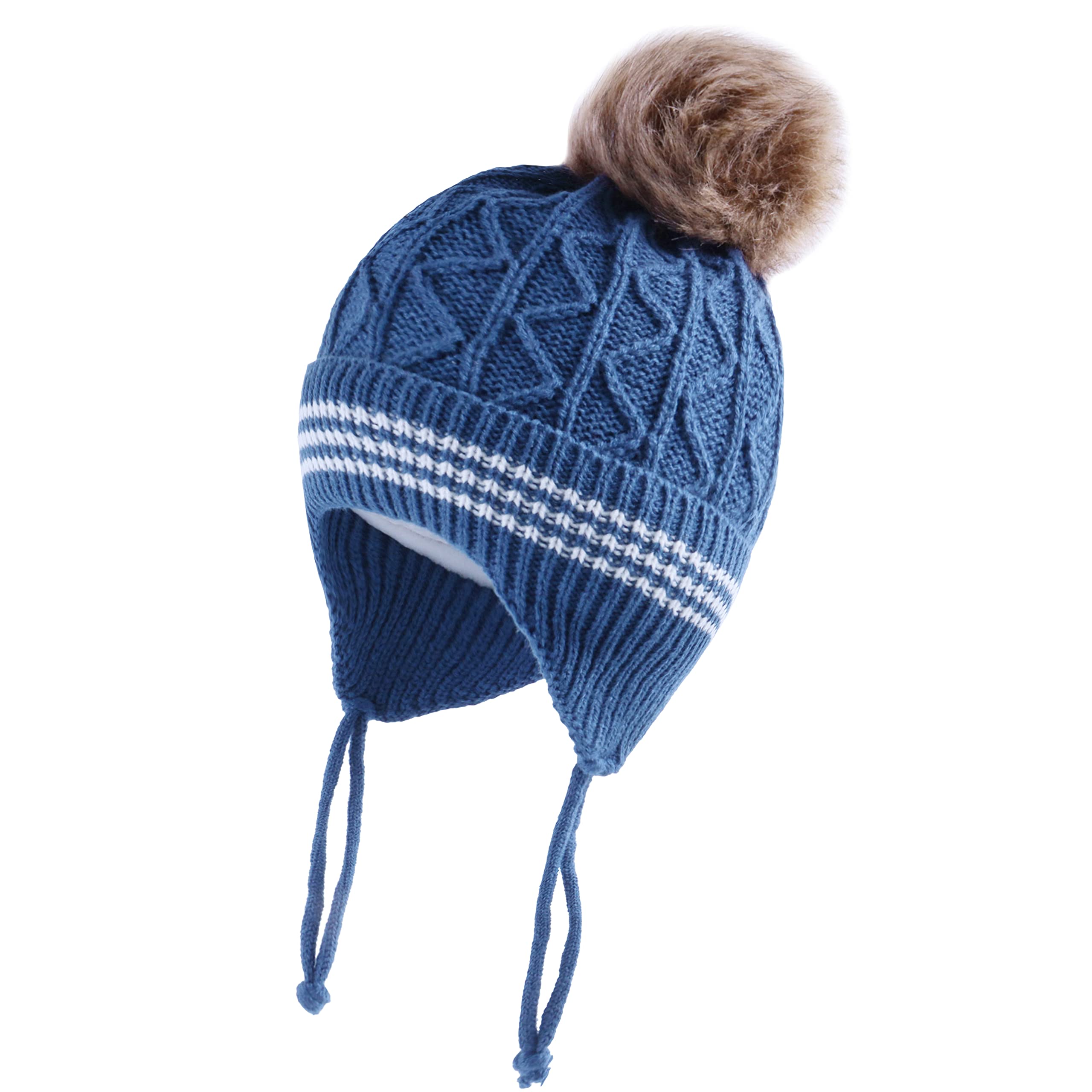 LANGZHEN Toddler Kids Infant Winter Hat Earflap Knit Warm Cap Fleece Lined Beanie for Baby Boys Girls 6-12 Months Blue-Pompon