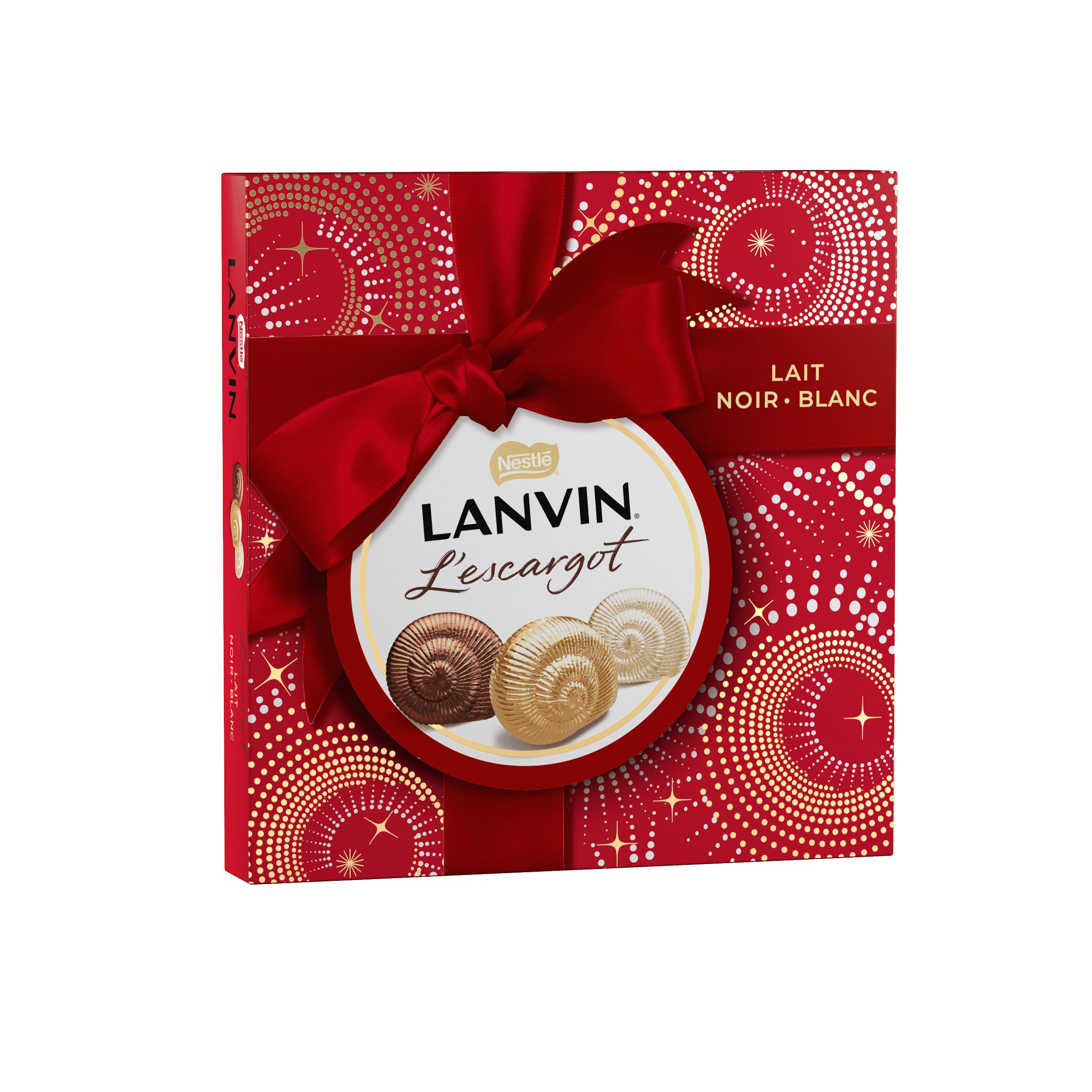 : Discover Lanvin's delightful gift of milk, dark, and white chocolate, presented in an elegant box, perfect for gifting to your loved ones. Inside this box, you'll find our iconic Lanvin Snails in dark, milk, and white chocolate. Created in 1934 in Burgundy, the Lanvin Snail will seduce you with its smooth praline, born from roasting almonds and hazelnuts, and its shell of delicious milk, white, and dark chocolate. The inimitable Lanvin praline is revealed. This rich, fruity, smooth, and melt-in-your-mouth praline is composed of a carefully balanced blend of selected almonds and hazelnuts, delicately roasted to enhance the flavors. With the Nestlé Cocoa Plan, and in partnership with the Rainforest Alliance, Lanvin is committed to more sustainable cocoa production and helps support farmers and their communities. Ingredients: Sugar, HAZELNUTS, cocoa butter , cocoa mass , ALMONDS, pastry BUTTER, whole MILK powder, skimmed MILK powder, whey powder, emulsifier (lecithins), natural vanilla flavoring, natural flavoring. Rainforest Alliance certified mass balance. www.ra.org fr. 23 hazelnuts and almonds. May contain: EGGS, GLUTEN, other TREE NUTS.Cocoa beans sourced from West Africa and Ecuador. Pure cocoa butter chocolate. This rich, fruity, smooth, and melt-in-your-mouth praline is composed of a carefully balanced blend of selected almonds and hazelnuts, slowly roasted and toasted to enhance their flavor. The inimitable LANVIN praline is revealed.Description du produit , Découvrez Lanvin plaisir d'offrir lait-noir-blanc, dans un écrin élégant, à offrir à vos proches , À l'intérieur de cette boîte, vous trouverez nos emblématiques Escargots LANVIN au chocolat noir, chocolat au lait et chocolat blanc. Créé en 1934 en Bourgogne, l'Escargot LANVIN vous séduira par son praliné onctueux né de la torréfaction des amandes et noisettes et par sa coque de délicieux chocolat au lait, blanc et noir. L'inimitable praliné Lanvin se dévoile,Ce praliné riche, fruité, onctueux en bouche et fondant au palais est composé d'un mélange savamment dosé d'amandes et de noisettes sélectionnées, délicatement grillées afin de sublimer les arômes en bouche,Avec le Plan Cacao NESTLE, et en partenariat avec Rainforest Alliance, LANVIN s'engage pour une production plus durable de cacao et contribue à soutenir les cultivateurs et leurs communautés. Ingrédients Sucre, NOISETTES, beurre de cacao , pâte de cacao , AMANDES, BEURRE pâtissier, LAIT entier en poudre, LAIT écrémé en poudre, PETIT-LAIT en poudre, émulsifiant (lécithines), arômes naturels de vanille, arôme naturel. Bilan massique certifié Rainforest Alliance. www.ra.org fr. 23 de noisettes et d'amandes. Peut contenir : ŒUFS, GLUTEN, autres FRUITS À COQUE.Des fèves de cacao parmi les es d'Afrique de l'Ouest et d'Equateur. Un chocolat pur beurre de cacao. Ce praliné riche, fruité, onctueux en bouche et fondant au palais est composé d'un mélange savamment dosé d'amandes et de noisettes sélectionnées, lentement grillées et torréfiées, afin de sublimer les arômes en bouche. L'inimitable praliné LANVIN se dévoile.Lanvin - L'Escargot Trio Lait Noir Blanc Chocolat De Noël - 296g Plein format