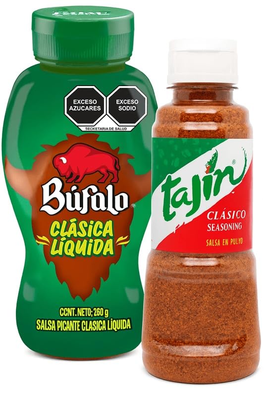 Turn any snack or meal into an authentic Mexican street food experience with this flavorful duo. This combo includes a bottle of Búfalo Salsa Picante Clásica Líquida (260g) and a bottle of Tajín Clásico Seasoning (142g) – perfect for tacos, fruits, veggies, chips, popcorn, micheladas and more. Main features Búfalo Clásica Líquida 260 g Soft, pourable Mexican hot sauce with a mild to medium spiciness. Spicy, savory flavor that enriches tacos, eggs, sandwiches, chicken wings and snacks. Convenient squeeze bottle for easy serving and precise control. Tajín Clásico 142 g Iconic chili-lime spices with a touch of salt. Delicious with fresh fruit (mango, pineapple, watermelon), vegetables, popcorn and as an rim for drinks. Resealable bottle to keep the herbs fresh and to sprinkle quickly. Authentic Mexican combo Two beloved Mexican pantry products in one handy set. Ideal for parties, family gatherings or to fill your kitchen with flavors that everyone will love. Great as a gift Ideal for gourmets, lovers of spicy sauces and anyone who loves Mexican cuisine. Easy to photograph together: place the Búfalo bottle and Tajín 142g next to each other for a clear 'combo pack' product image.Búfalo Salsa Picante Clásica Líquida (260 g) en een fles Tajín Clásico-kruiden (142 g) Verander elke snack of maaltijd in een authentieke Mexicaanse streetfoodervaring met dit smaakvolle duo. Deze combo bevat een fles Búfalo Salsa Picante Clásica Líquida (260 g) en een fles Tajín Clásico Seasoning (142 g) – perfect voor taco's, fruit, groenten, chips, popcorn, michelada's en meer. Belangrijkste kenmerken Búfalo Clásica Líquida 260 g Zachte, gietbare Mexicaanse hete saus met een milde tot middelmatige pittigheid. Pittige, hartige smaak die taco's, eieren, sandwiches, kippenvleugels en snacks verrijkt. Handige knijpfles voor eenvoudig serveren en nauwkeurige controle. Tajín Clásico 142 g Iconische chili-limoenkruiden met een vleugje zout. Heerlijk bij vers fruit (mango, ananas, watermeloen), groenten, popcorn en als rand voor drankjes. Hersluitbare fles om de kruiden vers te houden en snel te kunnen strooien. Authentieke Mexicaanse combo Twee geliefde Mexicaanse voorraadkastproducten in één handige set. Ideaal voor feestjes, familiebijeenkomsten of om uw keuken te vullen met smaken die bij iedereen in de smaak vallen. Geweldig als cadeau Ideaal voor fijnproevers, liefhebbers van pittige sauzen en iedereen die van de Mexicaanse keuken houdt. Gemakkelijk samen te fotograferen: plaats de Búfalo- fles en Tajín 142 g naast elkaar voor een duidelijk 'combo pack'-productbeeld.
