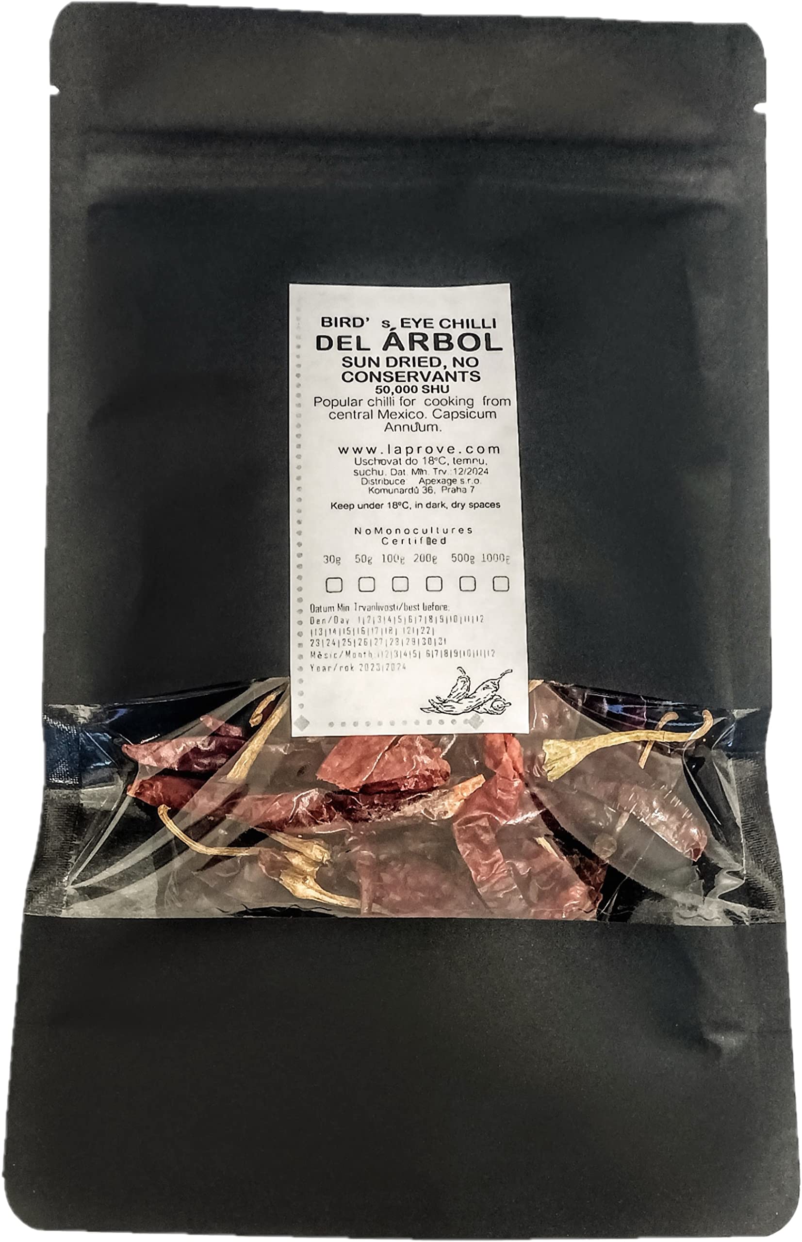 Chili del arbol, sun-dried. Capsicum Annuum Chile from Mexico and Central America. Widely used in Mexican cuisine. Chili is characterized by a spicy taste and rich aroma and can be cooked or raw or sliced. Chiles de árbol have a high content of vitamins C and A and have been cultivated since the Spanish period. The plant is larger than an average chili and has long, thin fruits of about 7 cm in length. After drying it takes on a bright red color. It is normally used in a dry state, although some gourmets prefer fresh. Often used in soups, ointments and sauces or for direct consumption. Very tasty variety that will suit most of the large choice of mild to medium Mexican dishes, such as Chili Con Carne.Chili Del árbol, geheel, hoogwaardig, zongedroogd, 30 g Chili del arbol, zongedroogd. Capsicum Annuum Chili uit Mexico en Midden-Amerika. Veel gebruikt in de Mexicaanse keuken. Chili wordt gekenmerkt door een kruidige smaak en een rijk aroma en kan worden gekookt of rauw of in plakjes gesneden. Chiles de árbol heeft een hoog gehalte aan vitamine C en A en worden al de Spaanse tijd geteeld. De plant is groter dan een gemiddelde chili en heeft lange, dunne vruchten van ongeveer 7 cm lengte. Na het drogen krijgt het een felrode kleur. Het wordt normaal gesproken in droge toestand gebruikt, hoewel sommige fijnproevers de voorkeur geven aan vers. Wordt vaak gebruikt in soepen, zalven en sauzen of voor directe consumptie. Zeer smakelijke variëteit die past bij de meeste van de grote keuze aan milde tot middelgrote Mexicaanse gerechten, zoals Chili Con Carne.