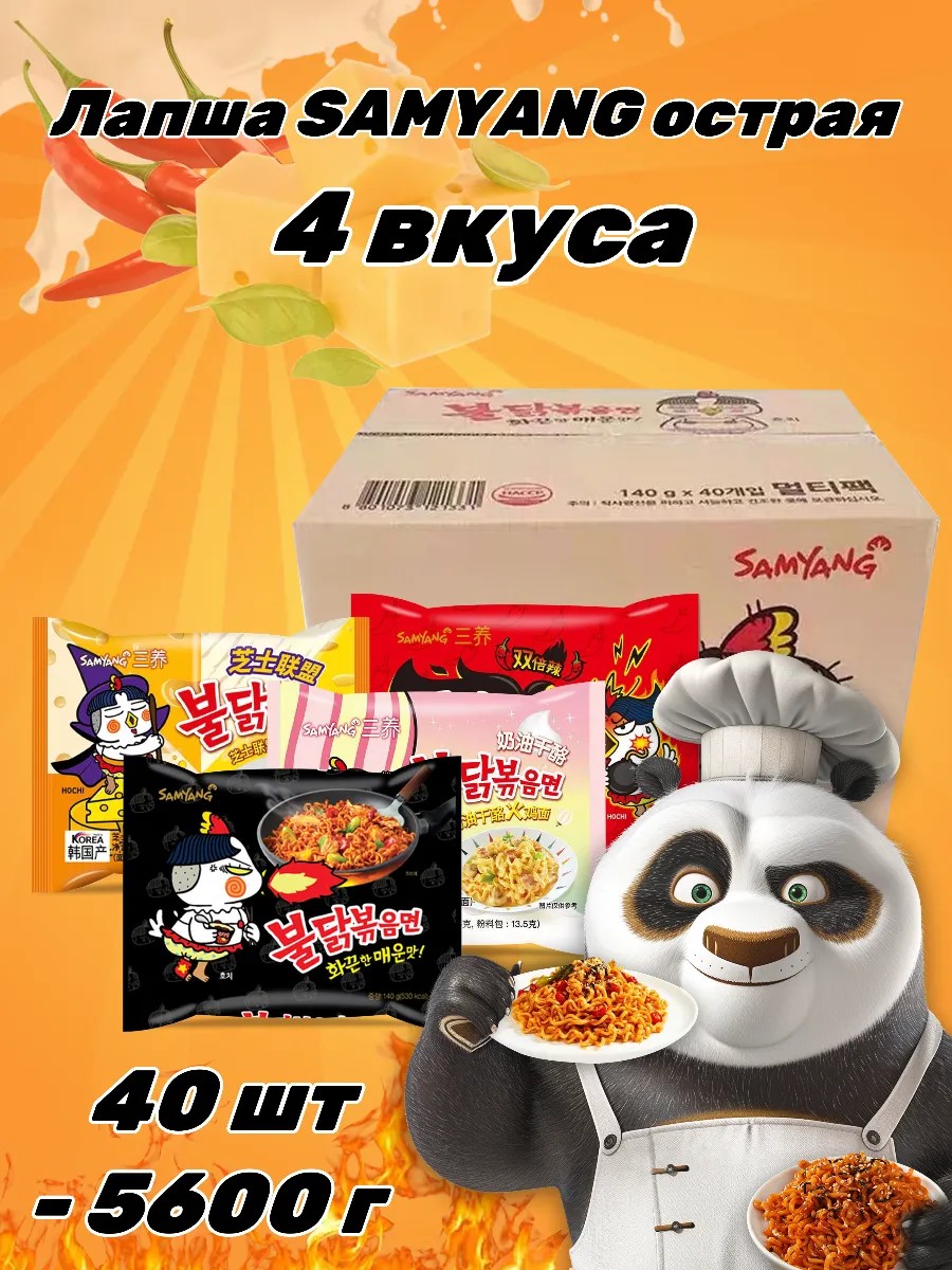 Острая лапша SAMYANG набор из 4 вкусов - 40 шт 5600 г. В набор входят вкусы: крем карбонара, острая курица, 4 сыра, двойной уровень остроты.