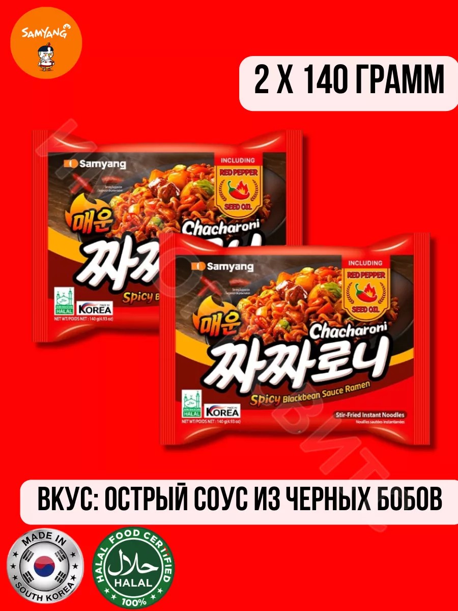 SAMYANG Spicy Chacharoni — популярное блюдо из лапши быстрого приготовления из Южной Кореи. В него входит жевательная лапша рамэн в остром китайском супе из соевой пасты. Лапшу легко готовить, что делает ее удобным и сытным вариантом еды.