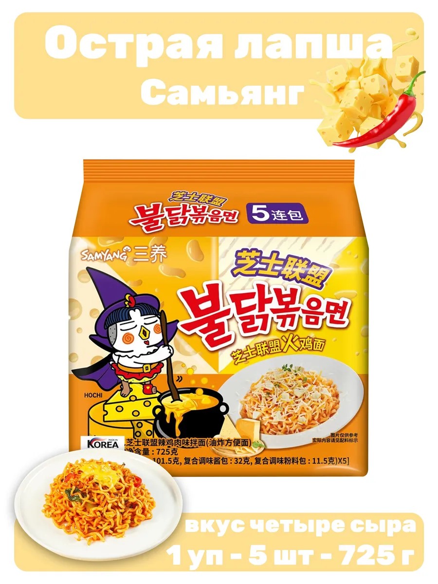 Лапша изготовлена в Китае, на корейском заводе, рецептура и технология изготовления соответствует корейскому производству. Лапша быстрого приготовления Бульдак Самьянг с очень острым соусом со вкусом четыре сыра 5 уп - 725 г. Соус очень острый, добавляйте его постепенно контролируя уровень остроты.