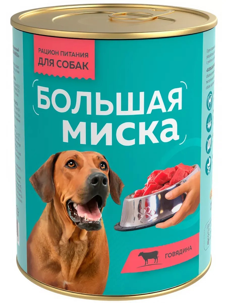 Корм Большая Миска (консерв. ) для собак, говядина, 970 г Консервированный неполнорационный корм для собак серии Большая миска с говядиной ГОВЯДИНА. Состав: говядина, растительный протеин, сердце, рубец, лёгкое, печень, растительные жиры, костная мука, желирующая добавка, соль, вода. Пищевая ценность на 100 г продукта: сырой протеин не менее 8, 0г, сырой жир не более 8, 0 г, углеводы не более 3, 0 г, сырая зола не более 3, 0 г, массовая доля поваренной соли 0, 5-0, 7 г, костная мука 1 г, влага не более 82% Минеральные вещества в 100г продукта: общий фосфор - не более 0, 8 г, кальций - не более 0, 9 г. Энергетическая ценность в 100 г продукта: 112, 0 ккал/469 кДж. Срок годности не более 3 лет со дня изготовления. Дата изготовления указана на банке. Условия хранения: при температуре от 0 C до +25 C и относительной влажности воздуха не более 75%. Рекомендуется употреблять при комнатной температуре. Перед подачей продукт необходимо перемешать. Открытую банку хранить в холодильнике не более 24 часов. Суточная норма: 70-90 г на 1 кг веса животного. Масса нетто: 970 г (жб)