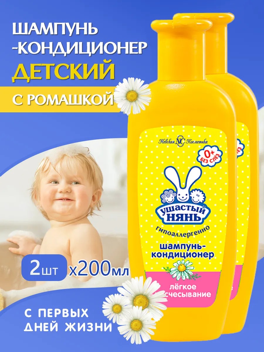 Детский шампунь кондиционер 2шт по 200мл, с первых дней жизни - 2в1 Ушастый Нянь с мягким экстрактом ромашки предназначен для ухода за волосами и кожей головы детей любого возраста, начиная с рождения, а также взрослых и детей с чувствительной кожей головы и склонных к аллергии. Мягкие моющие компоненты шампуня для детей прекрасно очищают даже длинные густые волосы, сохраняя естественный водно-жировой баланс кожи головы, облегчает расчесывание волос, не щиплет глазки, не сушит и не раздражает кожу. Средство по уходу за волосами делает волосы шелковистыми, укрепляет волосы и увлажняет кожу головы. Шампунь без слез. Экстракт ромашки смягчает и успокаивает кожу, придает блеск волосам. Натуральный увлажняющий компонент защищает, увлажняет волосы и кожу, укрепляет и улучшает состояние волос. Кондиционирующая добавка облегчает расчесывание, делает волосы более мягкими, объемными и послушными. Гипоаллергенный шампунь не содержит: красителей, щелочи, силиконов, парабенов, запрещенных ингредиентов. eo laboratorie детей детское душа коробка косметическое краситель крем лица масло младенцев натуральное новорожденных окошком оливковое парфюмерное пенка. Лучший детский шампунь, набор из 2 флакона по 200 мл.