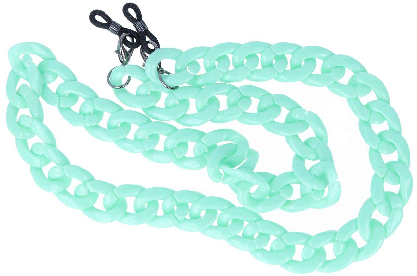Large pastel glasses in the chic design made of acrylic with rubber runs and stopper This elegant glasses chain in trendy pastel colors convinces with its stable material (acrylic) and its low weight.For attachment to the glasses, the large cell chain has a rubber run with a metal stopper.It is particularly suitable for sunglasses, but also operational for other models.Width: approx. 15 mm length approx. 65 cm nickel -free Color: aquamarin