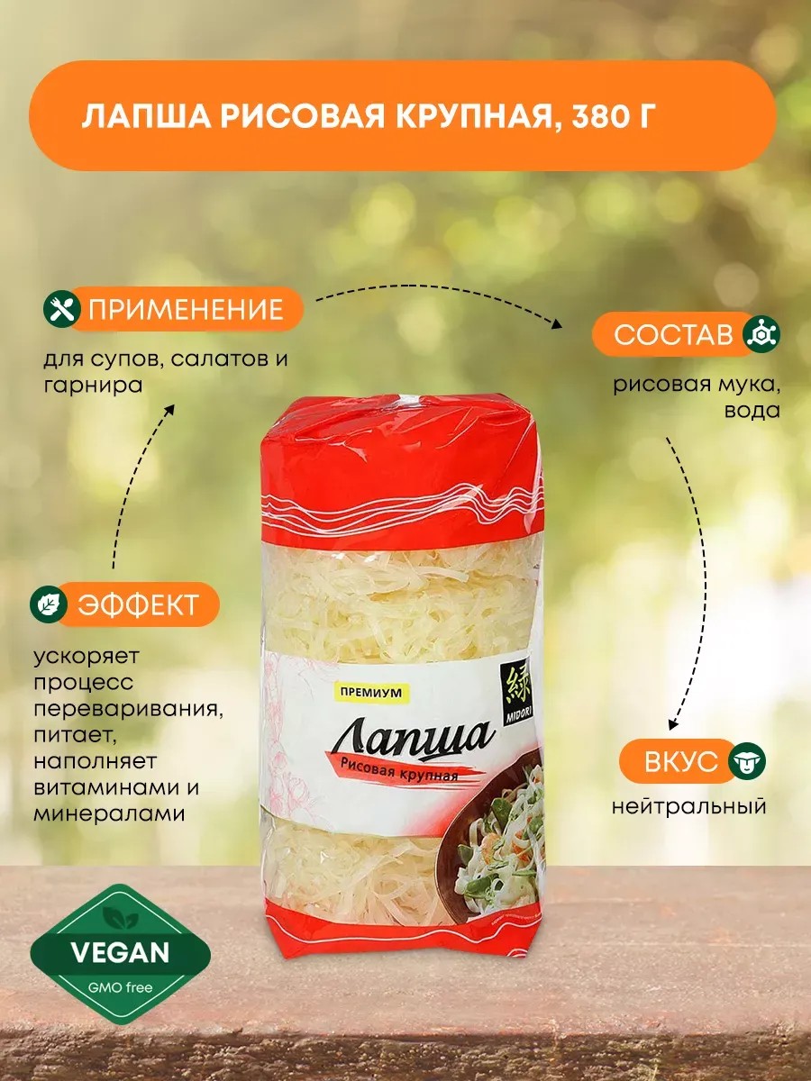 | Комплектация | рисовая лапша Мидори 380г - 1шт |