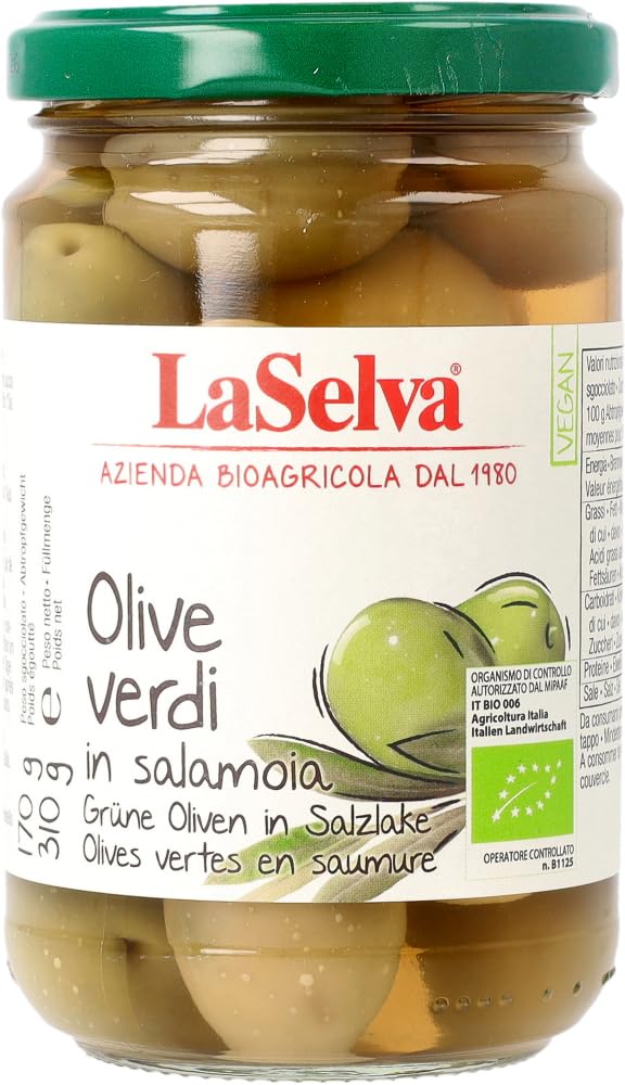 Finish: The olives are harvested early to best preserve their green color. Thanks to fermentation in a salt glaze, the product becomes flavorful and retains its firm texture. Certified organic by the German organic state label of the EU. SERVING INSTRUCTIONS These mild green olives are perfect for appetizers or salads and should be a staple on any appetizer platter. SAFETY WARNING Allergy information: Not used in production: eggs, milk, nuts, peanuts, sesame, gluten, soy, celery, mustard, lupin, mollusks See more