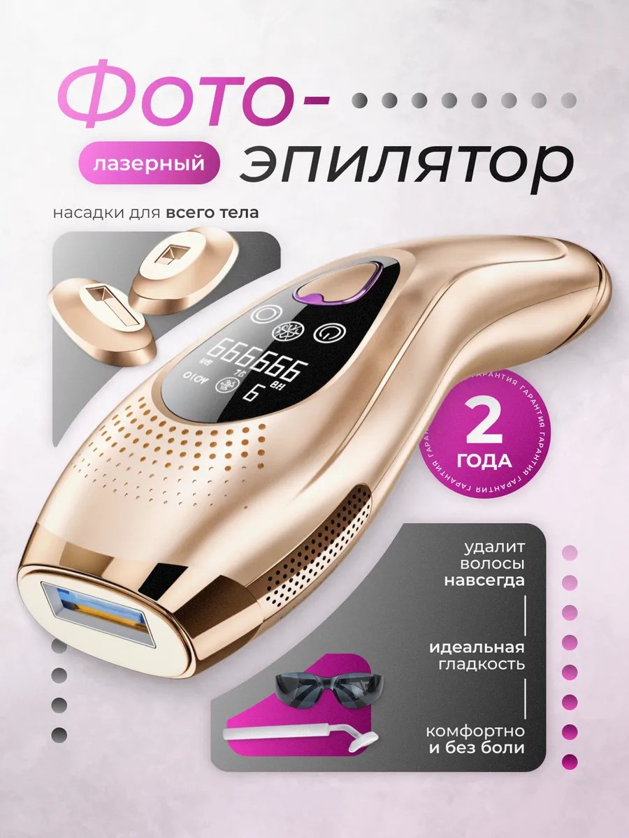 Откройте для себя революционное решение в уходе за кожей с нашим фотоэпилятором! Уникальный аппарат выполнен в стильном золотом дизайне, что придает ему элегантный вид и делает его прекрасным дополнением к вашему арсеналу по уходу за кожей. Он подходит для депиляции различных зон: лица, бикини, подмышек и ног.