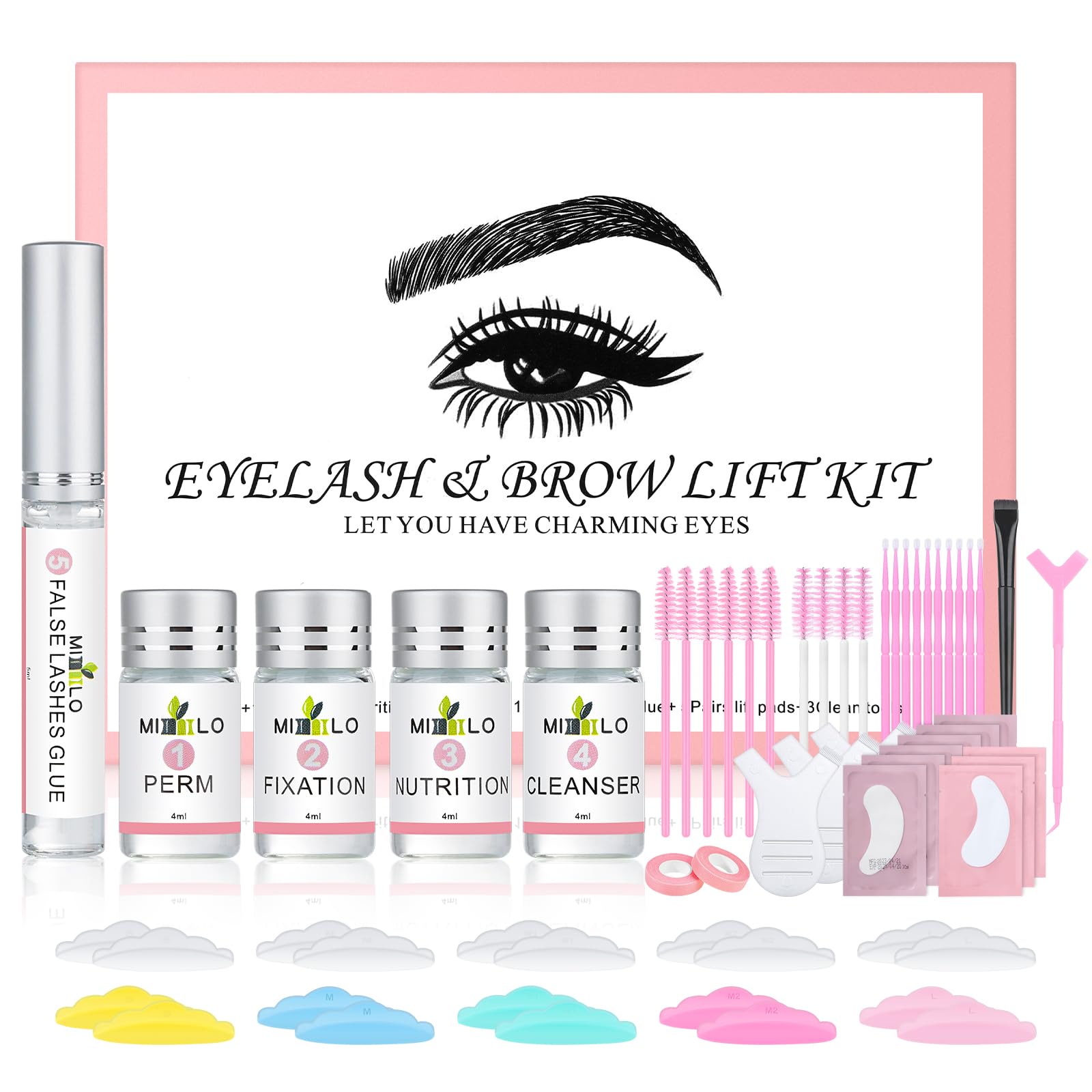 Usage: 1. Use the cleanser 4 to remove oil, dust, and makeup residue. 2. Apply the eye pads under the eyelids to protect your skin from the lotions. 3. Apply glue to the eye pads and place them on the upper part of the eyelid, ensuring they stay in place. 4. Apply glue on the eyelashes to secure them to the lift pads for 1 minute. 5. Use perm lotion 1 on the eyelashes and cover your eyes with plastic wrap.(Perming time: 10-12 minutes) 6. Remove perm lotion 1 using the Y brush, then apply fixing agent 2 on the eyelashes and cover your eyes with plastic wrap.(Fixing time: 10-12 minutes) 7. Use cleanser 4 and the comb side of the Y brush to clean off all residue. 8. Remove the lift pads from the upper part of your eyelid, then use nutrition lotion 3 to nourish your eyelashes. Safety Precautions: 1. Please remove contact lenses before usage. Ensure that the solutions do not touch your skin. If you experience red eyes or any other eye conditions, please stop immediately. 2. If the solutions get into your eyes or cause irritation, immediately flush your eyes with cool water for 15 minutes and seek medical attention. 3. Keep the product away from children at all times. 4. If you have sensitive skin or are prone to reactions, perform a patch test before usage. 5. Store the product away from direct sunlight to avoid damage.Up To 15 Times Uses: Offering exceptional value compared to others on the market, our lash lift kit contains an ample amount of high-quality ingredients that allow for up to 15 lash perms. Our lash lift kit incredibly easy to use. say goodbye to the hassle of constantly applying false lashes or extensions, as our kit provides a simple and effective solution for achieving stunning lifted lashes. Safe & Non-Irritating: Applying eye products can sometimes be challenging. However, our eyelash lift kit, made from the highest quality natural raw materials, ensures safety, non-irritation, and gentleness for the eyes. It includes a fast-drying lash lift glue that provides long-lasting hold. Our at-home lash perm kit delivers impressive and professional results, making it the best choice for achieving stunning lashes. Professional & Long-Lasting Effect: Our professional Lash Lift Set allows you to maintain beautiful and captivating eyelashes for 6-8 weeks. During this period, you can be free from the hassle of managing your eyelashes and enjoy naturally beautiful lashes. Give You Pretty and Brighter Eyes: Our Lash Lift Kit allows you to customize the shape of your eyebrows according to your preferences, giving you beautifully enhanced lashes. This will make your eyes brighter, stunning, and more captivating. Compared to using false eyelashes, the Lash Lift Kit gives you a more natural and gorgeous look. Eyelash Salon at Home: Our Lash Lift Set includes everything you need to curl your eyelashes at home, the lash lift s et is incredibly user-friendly, enabling you to effortlessly enjoy a salon-like eyelash experience in the comfort of your own home. Our Lash Lift Set includes a cleanser, lash lift pads, Eye Gel Path, clear lash glue, brushes, eyelash nourisher, and cleaning tools.