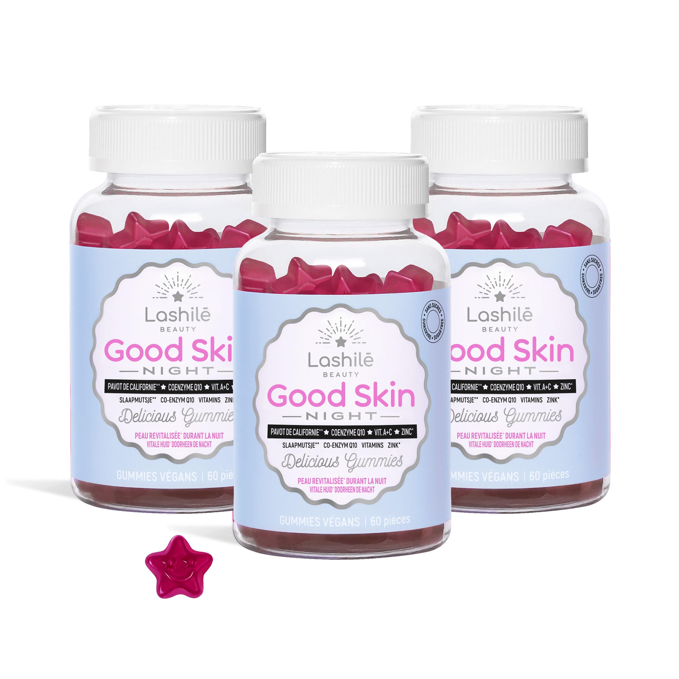 DIRECTIONS FOR USE: Take 2 gummies every night, just before bedtime. For lasting and visible results, follow a 3- to 6-month course. After 6 months, a one-month break is recommended. Enjoy 10 off when you buy 2 products and 15 off the 3-month pack. TWO DELICIOUS STARS TO SAVOR: Forget hard-to-swallow capsules! Enjoy a delicious treat every night: our strawberry or red berry flavored gummies blend perfectly into your nighttime beauty routine. ULTRA-DOSE FORMULA: An exclusive, vegan, gluten-free formula, free of artificial flavors and colors, made in France. The carefully selected ingredients include: California Poppy, Vitamin D, Vitamin B12, Zinc, Vitamin C, Coenzyme Q10, and Vitamin A. Each active ingredient plays a role: supporting sleep (poppy), cell division (D, B12), antioxidant protection (C, Zn), and maintaining normal, revitalized skin. REGENERATION NIGHT BEAUTY GUMMIES: Good Skin Vitamins Night is an innovative dietary supplement designed to renew skin overnight and enhance your complexion upon waking. Specially formulated to combine relaxation, restorative sleep, and intensive beauty action, its dual-action formula targets skin regeneration, cell strengthening, and the reduction of visible signs of fatigue from the very first weeks.CONSEILS D'UTILISATION : Prenez 2 gummies chaque soir, juste avant le coucher. Pour des résultats durables et visibles, suivez une cure de 3 à 6 mois. Après 6 mois, une pause d'un mois est recommandée. Profitez de -10 dès 2 produits achetés et -15 sur le pack de 3 mois. DEUX DÉLICIEUSES ÉTOILES À DÉGUSTER: Oubliez les gélules difficiles à avaler ! Savourez chaque soir une pause gourmande : nos gummies goût fraise ou fruits rouges se fondent parfaitement dans votre rituel beauté nocturne. FORMULE ULTRA DOSÉE : Une formule exclusive, végan, sans gluten, sans arômes ni colorants artificiels, fabriquée en France. Les ingrédients rigoureusement sélectionnés incluent : Pavot de Californie, Vitamine D, Vitamine B12, Zinc, Vitamine C, Coenzyme Q10, Vitamine A. Chaque actif joue un rôle : soutien du sommeil (pavot), division cellulaire (D, B12), protection antioxydante (C, Zn) et maintien d'une peau normale et revitalisée. GUMMIES RÉGÉNÉRATION BEAUTÉ DE NUIT : Good Skin Vitamines Night, complément alimentaire innovant conçu pour renouveler la peau pendant la nuit et sublimer votre teint au réveil. Spécialement formulé pour allier détente, sommeil réparateur et action beauté intensive. Sa formule double action cible la régénération cutanée, le renforcement cellulaire et la réduction des signes visibles de fatigue dès les premières semaines.Lashilé Beauty - Complément Alimentaire - Régénérateur de peau pendant la nuit - Good Skin Night - Made In France - Coenzyme Q10, Vitamine A, C, Zinc - Cure 3 Mois 180 Gummies 1 unité (Lot de 3)
