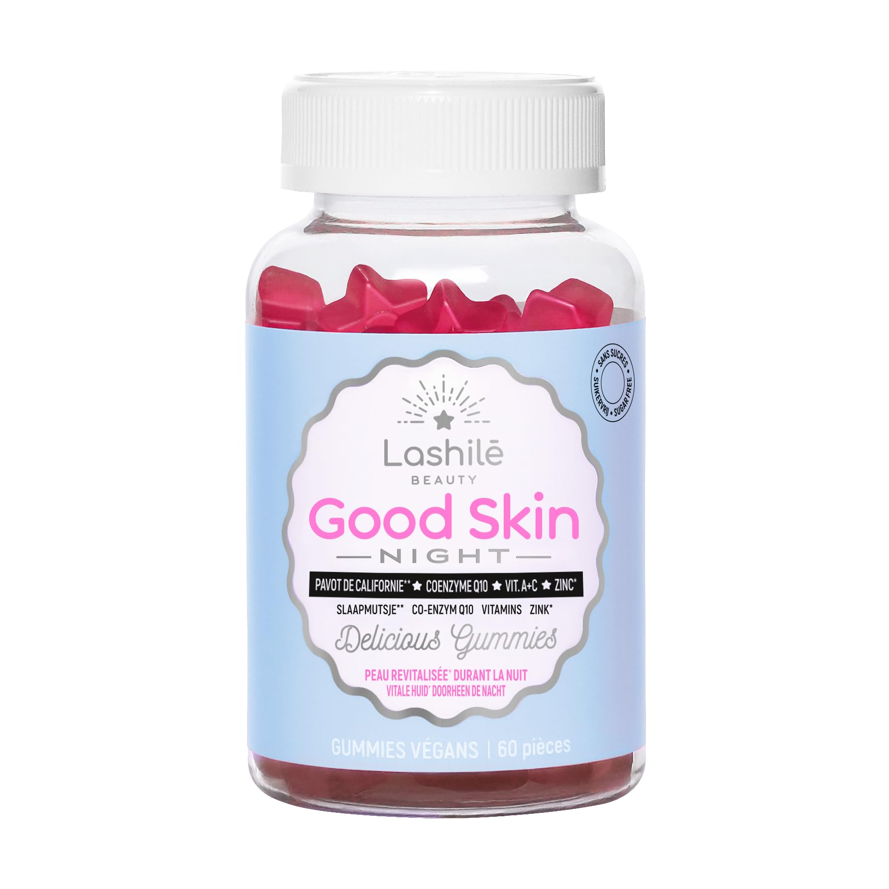 LASHILÉ BEAUTY – FRENCH EXPERTISE IN NUTRICOSMETICS: Lashilé Beauty is reinventing the use of dietary supplements by combining pleasure and effectiveness. Our innovative formulas, developed with carefully selected ingredients, fit easily into your daily routine to support your well-being and reveal your natural beauty from within. UNIQUE AND OPTIMAL FORMULA : Enriched with vitamins and minerals, our formula plays a crucial role in the cell division process thanks to vitamin D and B12, protects cells against oxidative stress thanks to zinc and vitamin C, and promotes the maintenance of normal skin thanks to vitamin A. . DOUBLE ACTION FOR SKIN AND SLEEP : Every day, our skin is subject to numerous aggressions such as pollution, stress and fatigue. Good Skin Night helps regenerate your skin while you sleep thanks to California poppy, which supports natural sleep essential for skin regeneration. ?. GOOD SKIN NIGHT ?: A new unique dual-action formula to support your sleep while promoting skin regeneration. These tasty gummies are easy to integrate into your evening beauty ritual. . Lashilé Beauty : French excellence and expertise in nutricosmetics. Our highly concentrated formulas offer you a taste journey, for beauty that radiates from the inside out and is visible from the outside in. ?.LASHILÉ BEAUTY – EXPERTISE FRANÇAISE EN NUTRICOSMÉTIQUE : Lashilé Beauty réinvente la prise de compléments alimentaires en alliant plaisir et efficacité. Nos formules innovantes, élaborées avec des ingrédients soigneusement sélectionnés, s'intègrent facilement dans votre routine quotidienne pour soutenir votre bien-être et révéler votre beauté naturelle de l'intérieur. FORMULE UNIQUE ET OPTIMALE : Enrichie en vitamines et minéraux, notre formule joue un rôle crucial dans le processus de division cellulaire grâce à la vitamine D et B12, protège les cellules contre le stress oxydatif grâce au zinc et à la vitamine C, et favorise le maintien d'une peau normale grâce à la vitamine A. . DOUBLE ACTION POUR LA PEAU ET LE SOMMEIL : Chaque jour, notre peau est victime de nombreuses agressions comme la pollution, le stress et la fatigue. Good Skin Night aide à régénérer votre peau durant votre sommeil grâce au pavot de Californie, qui soutient un sommeil naturel essentiel pour la régénération cutanée. ?. GOOD SKIN NIGHT ? : Une nouvelle formule unique double action pour soutenir votre sommeil tout en favorisant la régénération de la peau. Ces gummies savoureux sont faciles à intégrer dans votre rituel beauté du soir. . Lashilé Beauty : Excellence et expertise française en nutricosmétique. Nos formules hautement concentrées vous offrent un voyage gustative, pour une beauté qui rayonne de l'intérieur et qui se voit de l'extérieur. ?.
